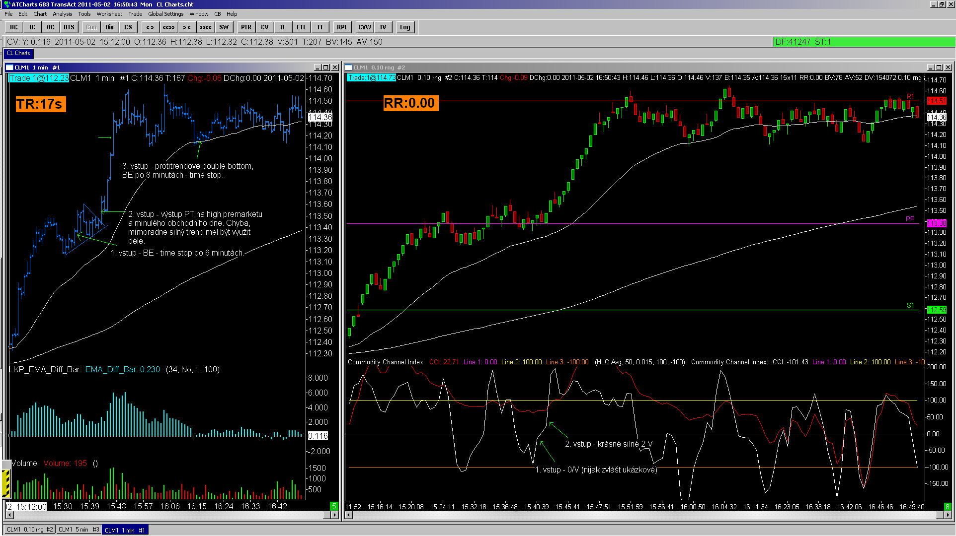 navratil, vsechno ma svoje pravidla, neni to jenom tak ledabyle. Zakladem je identifikovane zhusteni ceny, ktera je na SR urovni, pak vznikla reverzni usecka, ktera pro me byla vstupnim bodem a ukazala mi SL100 USD, pak uz vstupuju. Je to opravdu dost mechanicke, ale to neznamena, ze jsem se do tech grafu nenakoukal spousta hodin. Je dost dulezite si vsimat zhustenych oblasti, jak pro samotny vstup tak pro mista, kdy se vstupu vyhnout. Na vsechno se daji vymyslet pevna pravidla. Jinak dnes jedna chyba. Byl jsem akorat v obchode na TF (viz. aktualni deni na trzich) a nestihl jsem kvuli tomu vstup na CL. Jeste si porad na ty 2 trhy zvykam..