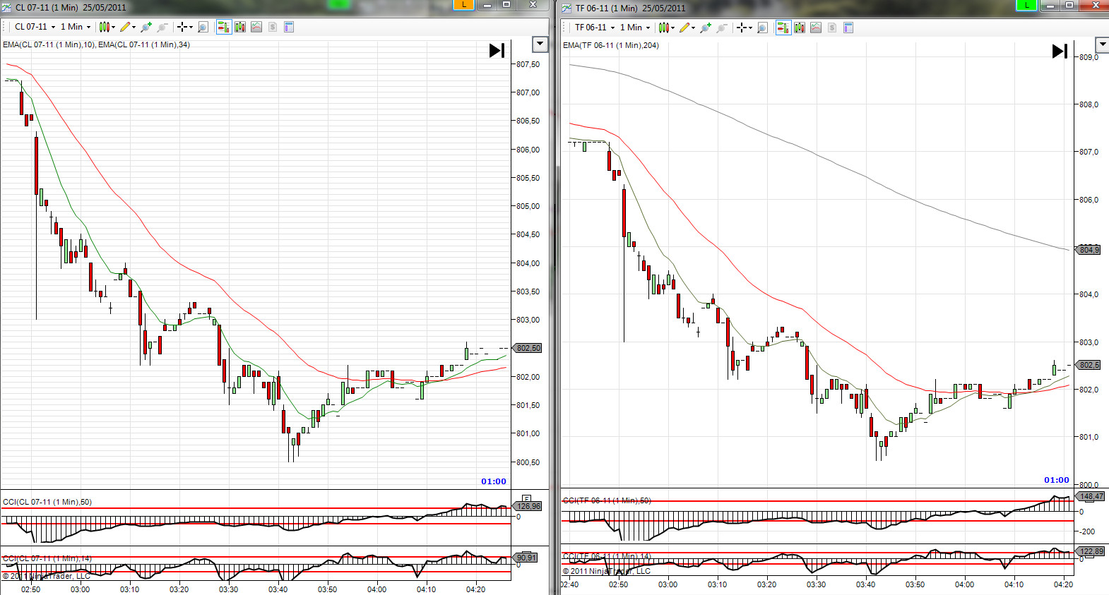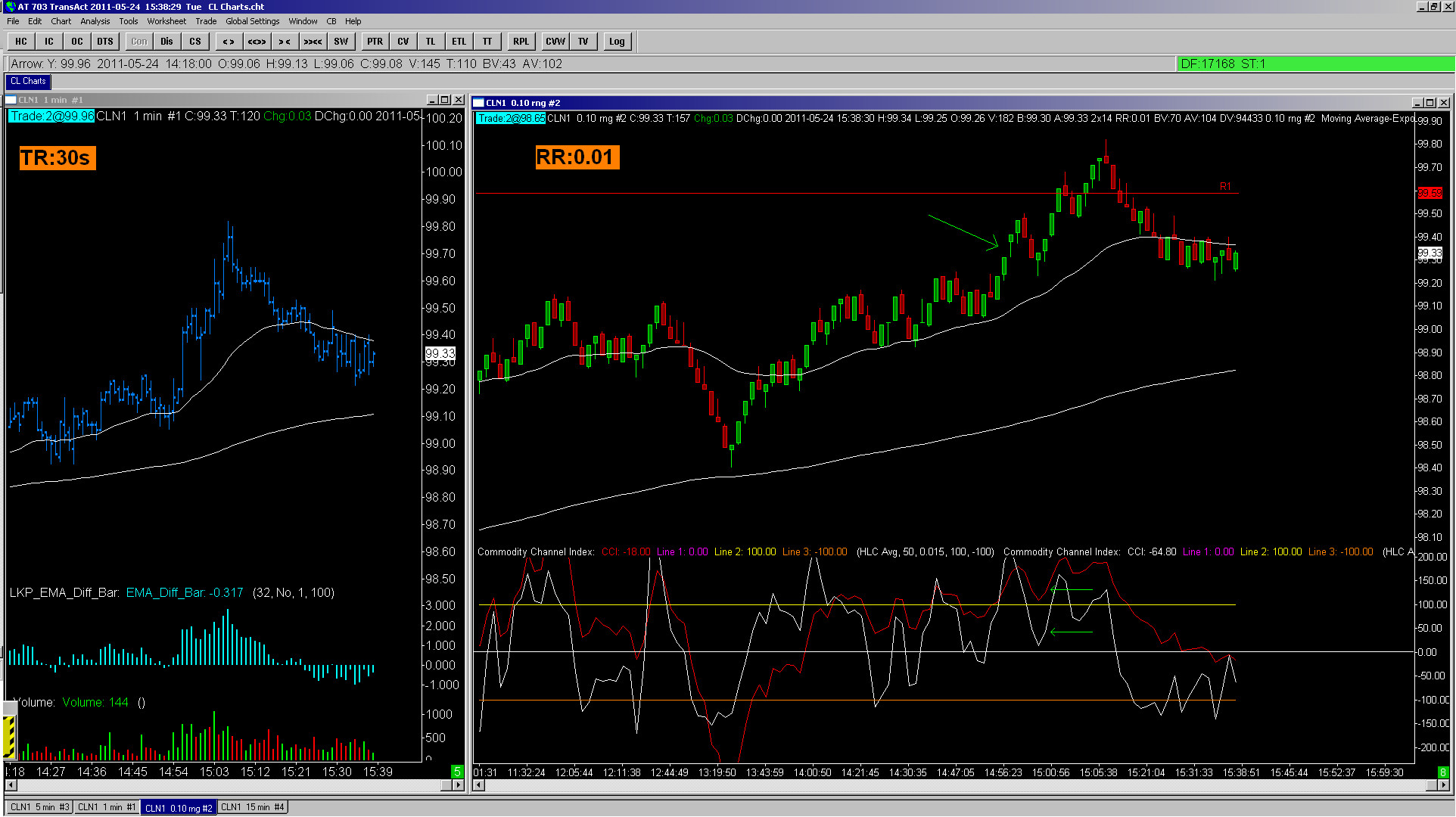 Screen: - v grafu 1 pěkný gap - dole v CCI nádherný Extreme 2 V. Teď ještě říct, co to znamená :) Jde o to, že trh nabere zásadní momentum ve směru trendu, které na RB 10 umožní nastoupit STP na konci RB, v rámci kterého se toto momentum zformovalo. Pokud se takto signifikantní momentum vytvoří na 10 ticích, je velká pravděpodobnost, že bude pokračovat dalších x ticků, tedy velká šance na úspěch. Tohle je v současnosti můj nejoblíbenější vstup.