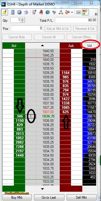 2. Nie, V DOM vidíš iba limitne príkazy, k príkazom stop verejný prístup nieje. to znamená že na BIDe na cene 1835 je 7288 kontraktov pripravených na nákup čize je tam na tej cene 7288 limitov na buy. pri ASK zasa naopak, na cene 1837 je 625 kontraktov. 625 limitov na sell, cize niekto by musel nakupit 625 kontraktov aby sa trh pohol o jeden tik hore.