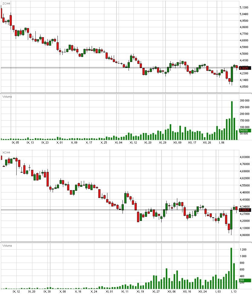 Na tom grafu je H4 (marec), to znamená, že nyní je blíže expiraci a je aktivní kontrakt, proto objem narůstá, předtím byl aktivní Z3 (december), který ano roloval do H4 nyní.