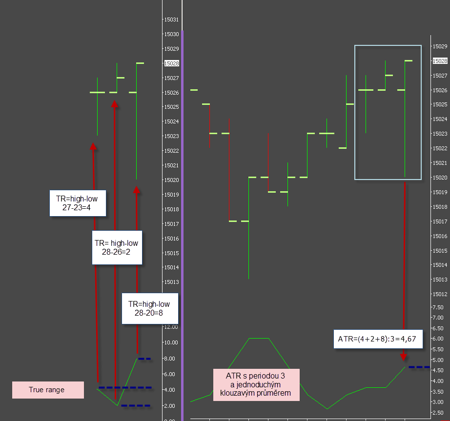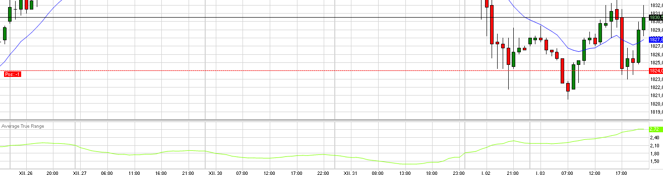 pesiak: Pokusím se vysvětlit obecný princip, pokud tě to nezajímá, odpověď na tvou otázku najdeš na konci příspěvku :) Nejprve co je "true range" -> TR je indikátor, který má hodnotu nejvyššího ze tří rozdílů: a) předchozího close a aktuálního high b) předchozího close a aktuálního low c) aktuálního high a aktuálního low -> v 90 procentech případů je to možnost c) (musí vzniknout gap nebo nová úsečka otevřít na jiné ceně a už se nevrátit zpět, než předchozí zavřela, aby se bralo a) nebo b)) Indikátor "average true range" (ATR) je v jen vyhlazení hodnot prostého indikátoru "true range" nějakým klouzavým průměrem za zvolenou periodu. => ATR má 2 možnosti nastavení: typ vyhlazení (typ kluzavého průměru) a periodu. Odpověď na tvou otázku: Pokud máš vykreslený hodinový graf (to máš) a zvolenou periodu 66 (to z obrázku nepoznám), tak ano, 2,72 znamená, že průměrná svíce za posledních 66 hodin má hodnotu 2,72 bodu (tzn. v ES 2,72*50 USD)