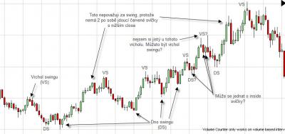 Dobrý den, může mi z Vás někdo pomoci? Právě také začínam se stavbou obchodního systému, ale na začátku bych si ješte ujasnil jestli rozumím a správně určuji swingy. Vrchol swingu určuji tak, že je třeba minimálně 2 po sobě jdoucích svíček s vyšším low, vyšším close a vyšším high následovanými 2 po sobě jdoucími svičkami s nižším low, nižším close a nižším high. Pro dno swingu je to opačně. V přiloženém obrázku jsem určil swingy v trendu a mám tam 2 situace, kterých si nejsem jistý jestli se jedná o swing, či nikoliv. Budu rád za vaše reakce...