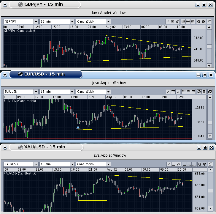Z pohledu intraday vidim diagonalni trojuhelniky na eur/usd; gpb/jpy a hlavne na zlate xau/usd. Snazim se delat analyzu podle elliottovy teorie a eur/usd vidim silne nahoru.