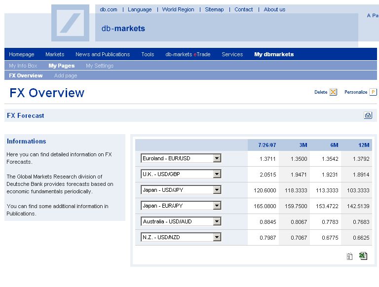 to all uz tu bolo zopar krat spomenute, ze 97% obchodov robia ti velki a preto by nas (pozicnych) malo zaujimat co si o vyvoji myslia prave oni. Najvacsim hracom je nepochybne Deutsche Bank. Tym, ktori si nemozu pre zaciatok dovolit Bloomberg alebo Reuters davam do pozornosti www.db-markets.com, kde mozete najst aktualne analyzy, ale i forecasty na rozne obdobia. Staci sa len zaregistrovat a studovat. Zelam pekne vzdelavanie. Ralf