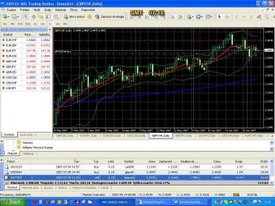 kunas ano, ale teď žádný otevřený nemám, na dením grafu určím trend podle ema 200, pouze podle sklonu, když je nahoru tak tren sever a naopak dále mám najete bollingerové pásma a když je trend sever tak čekám až trh skoriguje ke spodní hraně bollingeru a jdu na buy , PT dáván na druhou stranu bollingeru