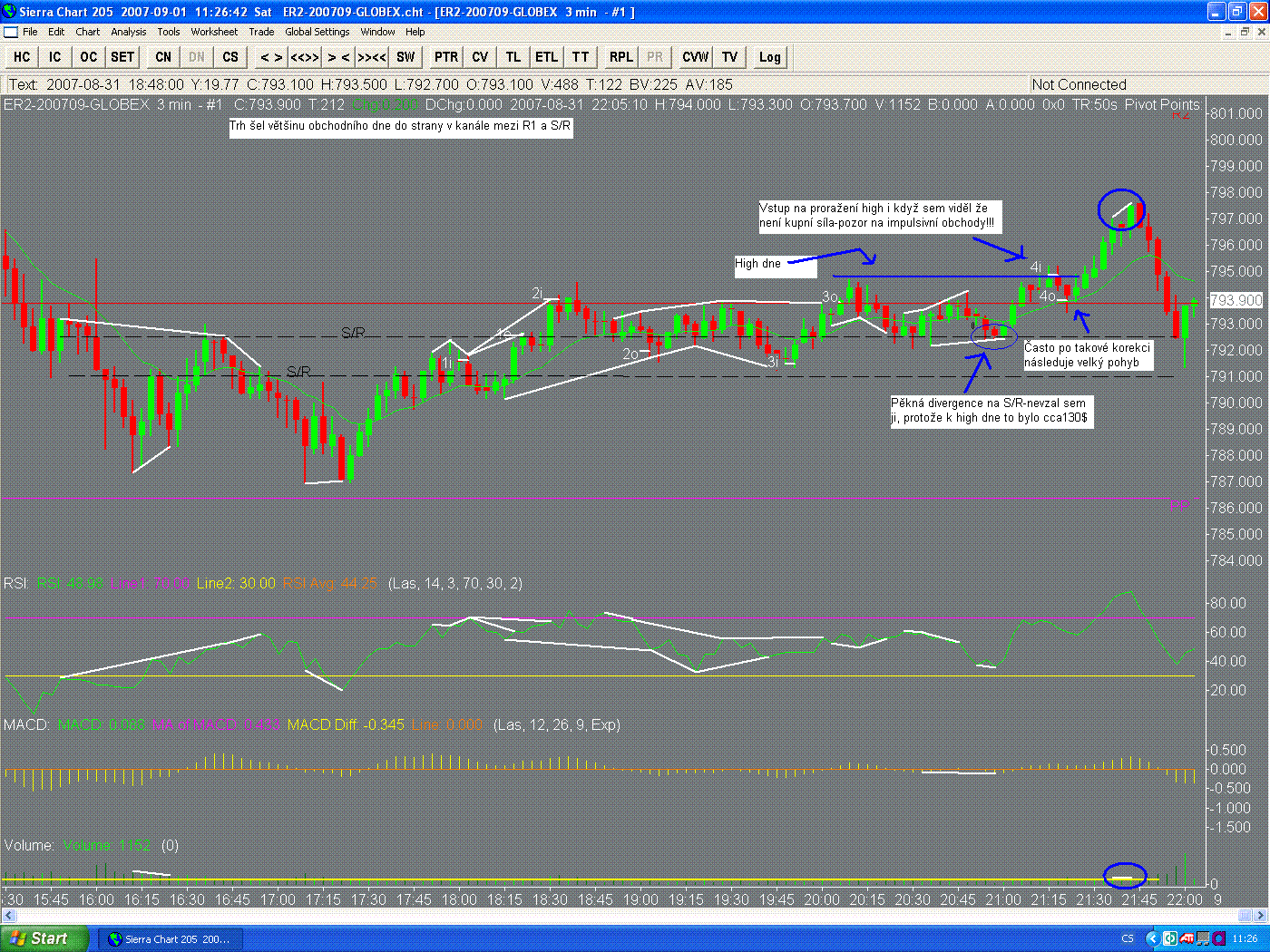 Zdravim. Zda se mi, ze clanek je to o vystupech a plne souhlasim s autorem, ze pracovat na nich je mozna dulezitejsi, nez vstupy, novy paterny atd. Proste, jak zustat v obchodu co nejdyl a vytanout z nej co nejvic. Za posun SL prece komise neplatime, ze ??:)) Je to moje oblibena filozofie a rad podiskutuju, hlavne s temi, kteri obchoduji divergence. Ja obchoduju hlavne divergence a na zaklade nich taky vystupuju. Rad bych se proto vratil k diskusi a ukazal, jak posunuju SL ja a to jenom na zaklade divergenci. Na obrazku jsem posunoval 2krat a vystup 2 kontraktem byl v tomto pripade jenom o kousicek niz, nez 1. kontraktem (nad pomerne vysokou bullish svici). V kazdym pripade tenhle zpusob mam otestovanej na minimum 1000 obchodech (a kolem 300live) a funguje velice dobre. Zdravim Pavel