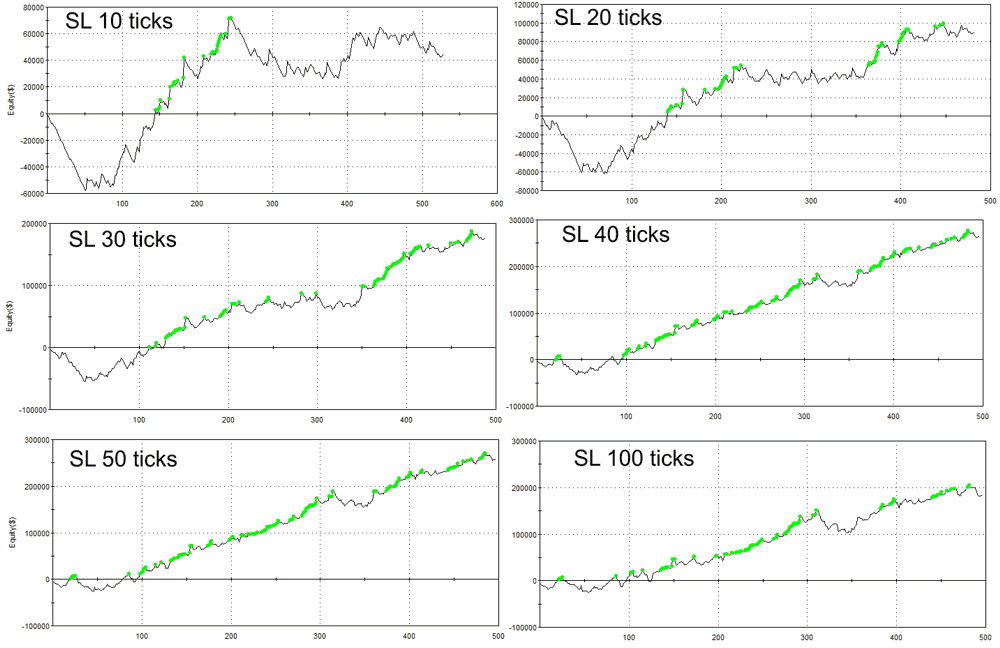 Pro správné umístění SL je podle mého názoru důležitých několik věcí. Je třeba si nejdříve promyslet, jaký je vlastně váš styl obchodování, protože ten bude do značné míry determinovat, zda bude vhodné použít fixní SL nebo SL vázaný na nějakou S/R úroveň. Dám příklad - pokud obchodujete patterny, pak je logické umístit SL nad/pod hladinu, kde pattern pro vás selhává, typicky pokud např. zobchodujete long pro průrazu dejme tomu double top patternu, pak předpokládáte, že stávající top (rezistence) bude nyní support a SL umístíte několik ticků pod a jestli to bude 10 nebo 20 ticků pod vstupem, bude prostě záležet na tom, kde vstoupíte. Pokud jdete čistě po R:R ratio a víte, že váš PT je x ticků, tak si prostě umístíte SL dejme tomu x/2 od vstupu a je vymalováno. Pokud je pro vás nejednoznačné, kde SL díky vaší obchodní taktice (různé podmínky pro vstupy atd.) umístit, pak se můžete rozhodnout individuálně, nicméně v každém případě je vhodné pokud možno otestovat vliv různých typů a hodnot SL pomocí backtestu. Nevím jak se taky připojujou obrázky, jestli se dají na konec příspěvku nebo jinak, chtěl jsem jenom demonstrovat vliv různě položených fixních hodnot SL na výkon strategií. Z obrázku je patrné, že existují určité "zóny", kam je vhodné SL umístit. Obecně také platí, že čím vyšší timeframe obchodujete, tím bude "bezpečná" zóna SL dále od entry (jinak řečeno na 1 min grafu např. TF - Rusell bude možné pracovat se SL někde v řádu 10 - 20 ticků, na 60 min grafu už to bude spíše v řádu 50 - 100 ticků), samozřejmě na typu vaší strategie, nelze paušálně říct, že na 1 min grafu si prostě nastavte 10 ticků. Tak tedy z obrázku je patrné, že příliš těsné SL sice sníží risk na 1 obchod, nicméně způsobí značné snížení výkonu dané strategie a výrazný nárůst drawdowns (Sl do 20 ticků = 2 bodů na TF). "Bezpečná zóna" začíná někde kolem 30 ticků a končí cca u 50 ticků. Všimněte si, že zvětšování SL nezpůsobí celkové zvýšení výkonu strategie lineárně, ale existuje jakýsi "bod zlomu", nad kterým se výkon začne opět snižovat. Předpokládám, že se otázkou položení SL na finančníku zabívají více do detailu v některém z článků, takže to by pro první přiblížení snad stačilo. :)