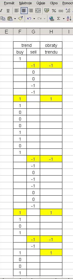 Aby ve sloupci H tj. obraty trendu byla v nějakém řádku 1, tak musí být splněna podmínka, která říká: na odpovídajícím řádku ve sloupci F musí být 1 a zároveň na odpovídajícím řádku ve slupci G musí být "" tj. nic ergo prázdná buňka (z obrázku to nejde poznat, ale předpokládám že je to prázdná buňka - jestli je to mezera tak si ve vzorci "" nahraď " ") a zároveň o řádek výše ve slupci F musí být nic a zároveń o řádek výše ve sloupci G musí být -1.