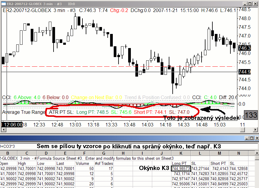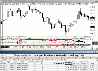 Do K3, L3, M3 a N3 se zadají vzorečky - stejně jako v Excelu. Klikne se do okýnka K3 a ve vrchním řádku toho worksheetu se zadá vzorec, například, chceš Last + ATR * 3, tak se zadá =E3+CO3*3 (ty místo CO3 zadáš název sloupce, v kterým je to ATR, případně jiný indikátor, který potřebuješ pro výpočty) a Enter, to stejný v dalších třech okýnkách. Můžou se používat samozřejmě i složitější vzorce, třeba jako IF apod.