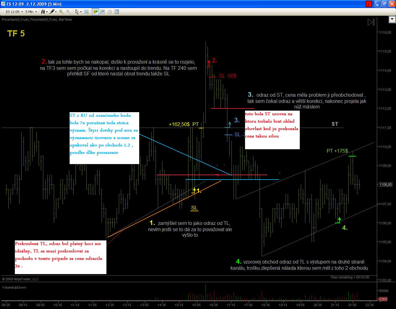 Ahoj casablancax, prikladám screen s komentármi, ale rozvediem to aj tu. Teda ak zakreslíš TL tak tá nemá doživotnu platnosť , ale len do momentu jej porušenia , stalo sa tak vo viacerých bodoch preto ju bolo treba prekresliť , vstup ktorý si tam urobil bol odrazom od TL. Obchodč.2 ten ani nepotrebuje komentár snád len to, že aj keby tam nebola SF formácia po takej obrovskej úsečke kde sa vyčerpal hlavný pohyb vstupovať do longu je samovražda. Obchodč.3, čo sa udialo, po prudkom náraste kde sa nabalila väčšina longových obchodníkov došlo k výberu ziskov a zrazu sa longáči stratili , došlo k poklesu ceny čo využili "medvedíci čistotný" na urovni 1112 sa zmobilizovali býci a snažili sa uhájiť pozíciu čo sa im aj dosť darilo no medvede tlačili cenu aj tak nižšie (klesajuce high) možno už po druhej úsečke ST pod tuto uroven natlačli obchodníci čakajuce príkazy a to spustilo lavínu ktora preobchodovala aj sponu ST hoci mohla byť aj úvaha o odraze ceny no vzhladom na výrazne prerazenie ST vyššej urovne čakačkami by som to neriskoval. Iná situácia by bola keby došlo k pozvolnemu priblíženiu ceny k tejto ST úrovni , vtedy by som to bral do protitrendu. Všimni si ešte 2 TL ktore som naznačil , červenu a modru. Červena je z RU kde som Ti chcel ukazat ako slelktovat ST urovne, červena bola 7x porušená teda startila význam a mažem ju, pod nou modrá vyšla z dalšej RU a ta potvrdila platnosť ST bodmi ako pri "hornom " obchode, všimni si tu situáciu , je ako cez kopirák , tam stačilo umiestniť čakačku a nastaviť kapsu...... ;) "Slabý verí v šťastie , silný v príčinu" Gladiator028