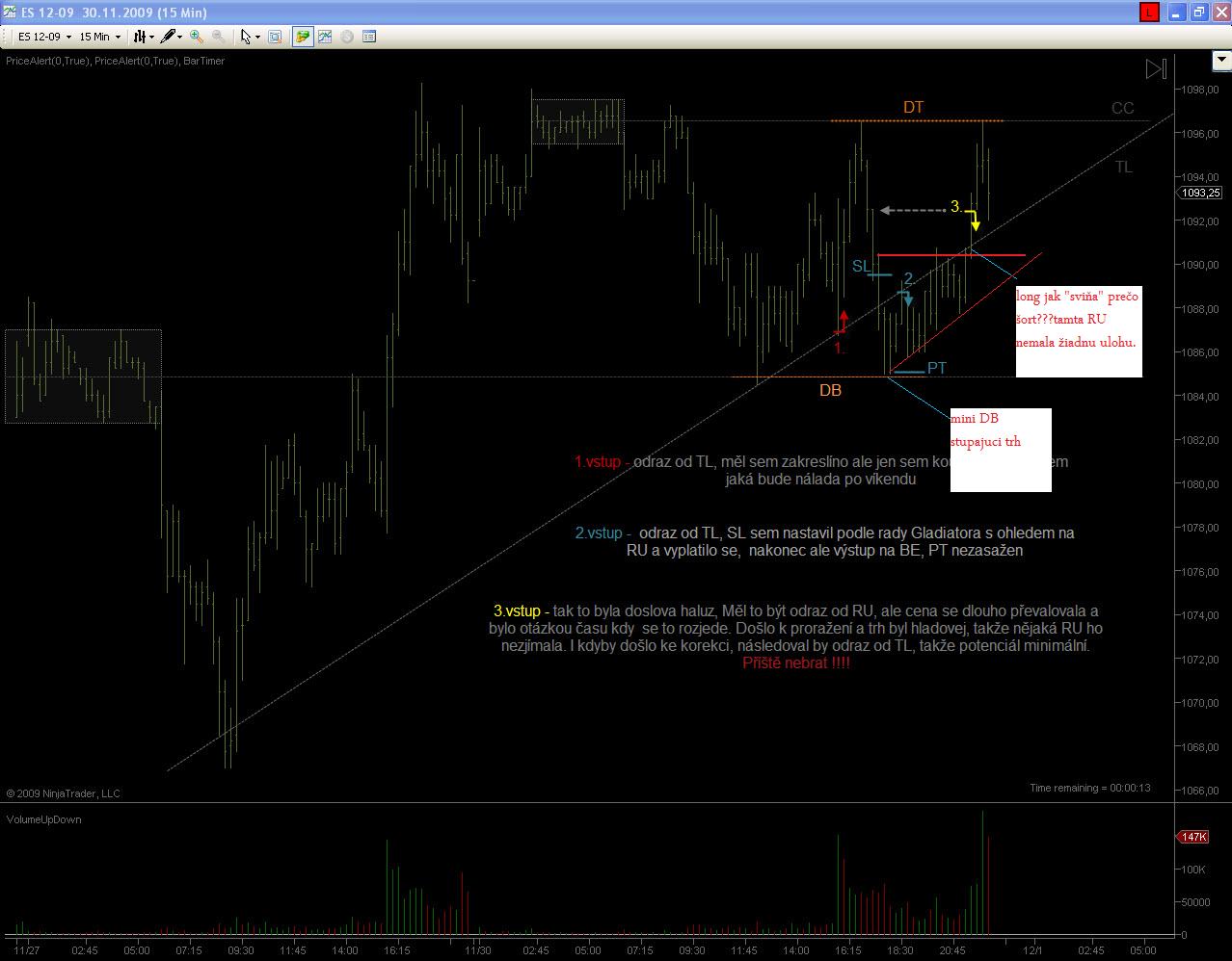 Ja idem momentalne len ES, je vela hodin, zajtra hodin screen s mojim pohladom, dnes "BE", bol som v tom longu, len kvoli tomu "prevalovaniu" ceny a nasledne vytvorenemu na 3 min. tf "3U" do shortu o ktorom som vedel, ze asi platny nebude, lebo nebol dokonceny a vsetko nasvedcovalo tomu, ze sa stale jedna o up trend, no tomu 3U hralo do karat aj to, ze to na 30 min. tf-ku bola krasna vlajka,v ktorej sa vytvoril tento 3U a to ma zmiatlo...prisli tam aj 2 doji usecky a nieco ako prerazenie do shortu, tak som to zavrel a v zapati to vystrelilo hore, no co k tomu dodat, na porazenie....