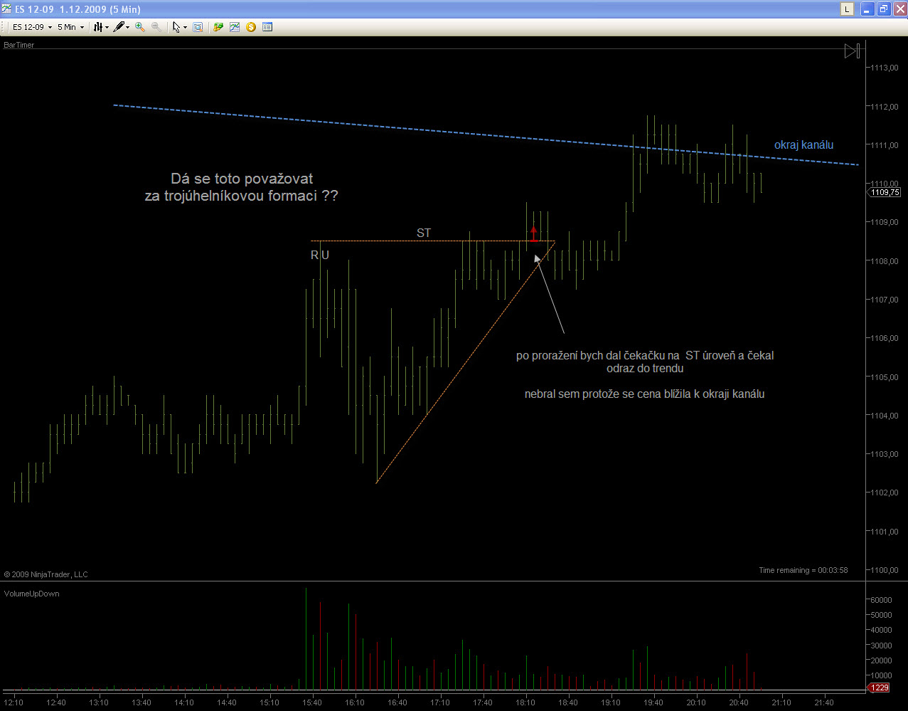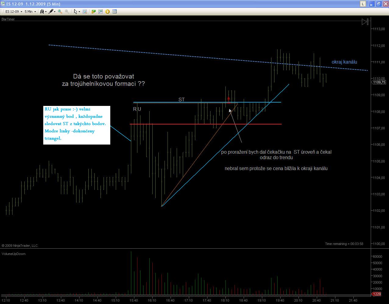 Ahoj Gladiator, Ten včerejšek nebyl na rákosku, ale na pořádnou palici, hlavně ten 3. obchod, to byl prostě úlet. Snažím se z chyb poučit, tak snad jich bude čím dál míň, ale raději zatím moje obchody pročítej až k ránu. To by ještě chybělo, aby ses kvůli mně nevyspal. ;) Teď k dnešku. Měl bych prosím Tě jeden dotaz k 3U formaci. Sice sem ji nebral, protože potenciál byl malej, ale pro příště. Na obrázku sem to zakreslil a jde mi o to, zda se to dá považovat za trojúhelník a jestli do toho příště jít i když to dnes selhalo. Popřípadě kam umisťovat SL. Abych dnes nedělal takový kopance jako včera, našel sem si na TF240 kde budu řešit protitrendový obchody. Ostatní jen do trendu a při silném signálu a vyplatilo se.