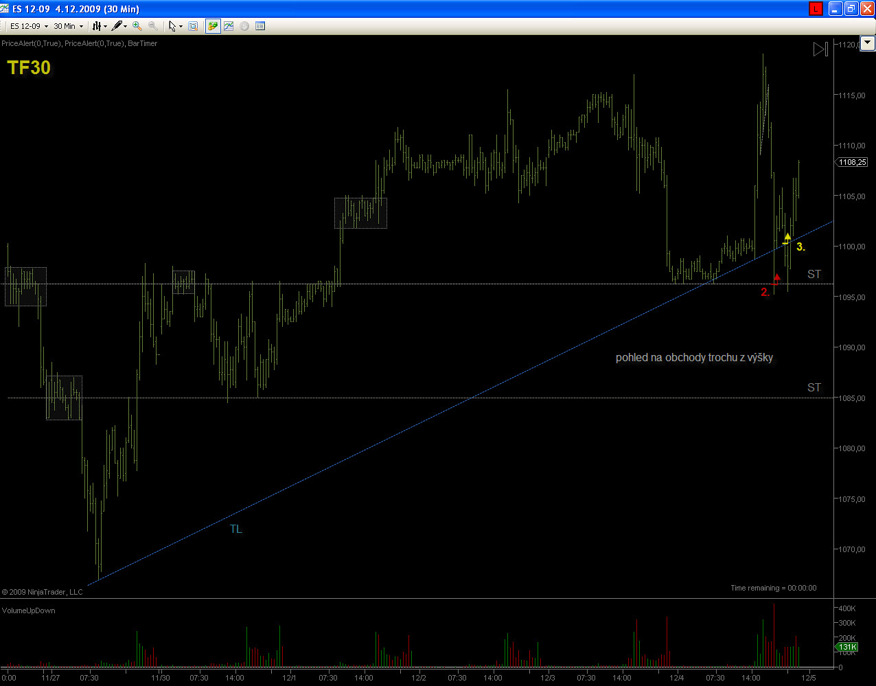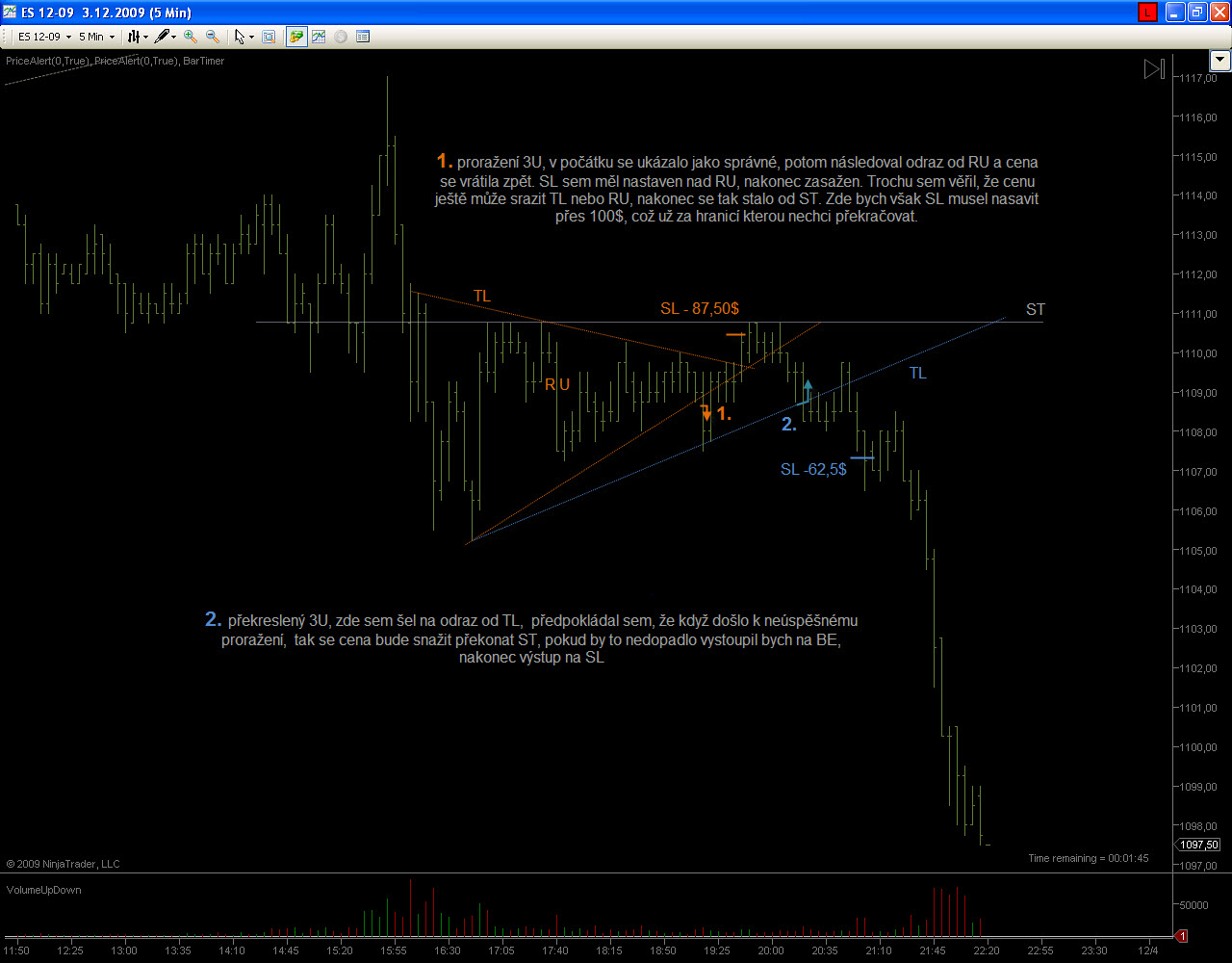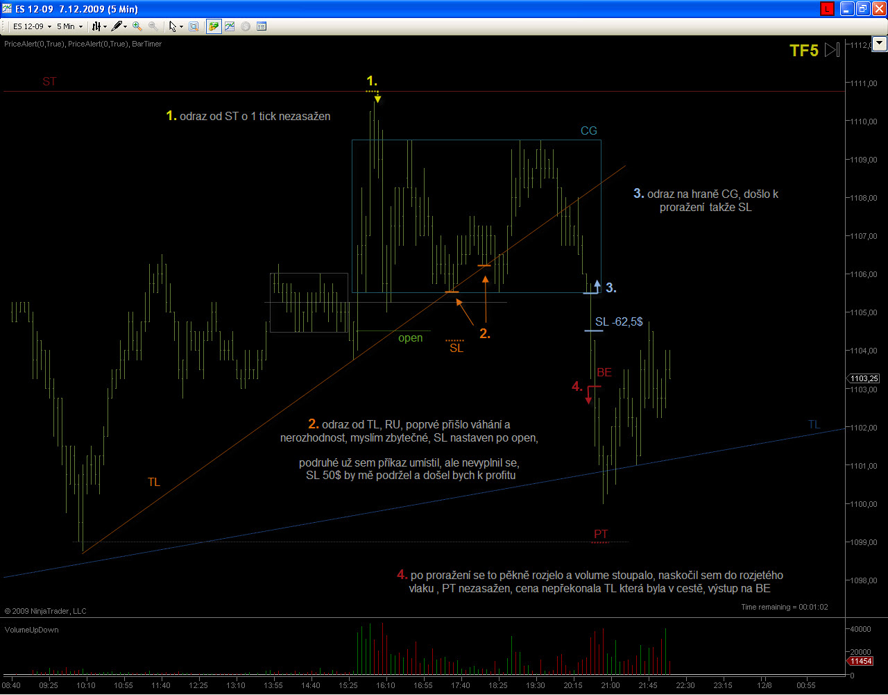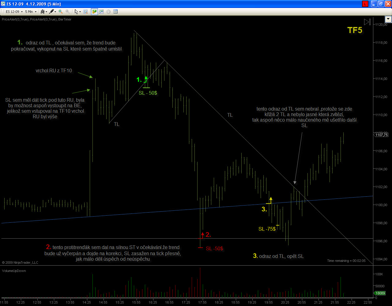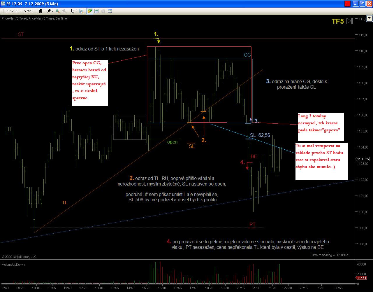 Ahoj casablancax, k obchodu č.1, ten bol úplne od veci ako si aj pochopil..bohužial neskoro.. ;) obchod č.2 bol úplne v poriadku akurát nevydržal SL, ale take veci sa stávaju aj mne, bud to nezoberie čakačku kôli jednemu ticku , alebo ma vyhodí tak ako teba zas kôli jednemu ticku, takže z toho si nerob hlavu ide len o to ako to zoberieš , či si to budeš vyčítať , alebo sa otrasieš a ideš dalej . Je velmi dôležité vediet čítať graf , lebo aj keď Ťa trh vyhodí ako sa to stalo a vzápätí sa vráti do smeru ktorý si predpokladal, treba hneď reagovať a ísť do toho, je nezmysel len pozerať na to paralizovaný, keď vieš že Tvoj predpoklad sa naplnil hoci Ťa to stalo SL. Obchod č.3 bol zase úplne mimo, TL mala opodstatnenie do 14:30 keď došlo k výraznemu odrazu trhu , potom bola výrazne prekonaná vrámci volitality trhu na základe tejto informácie si nemal vstupovat na tejto TL do protitrendu , už zo samotneho pohladu na formáciu bolo zrejme že k odrazu nemôže dôjsť, ale to Ti zbytočne budem vysvetlovat to sa musíš naučiť rozpoznat sam. Hornu TL máš zle zakreslenu, pozri screen. Pri kreslení nie stále sleduješ vrcholy úsečiek , uprednostnuješ SF ktore tam sú a spravidla a niesu daleko od vrcholu. Na screenoch som vyznačil aj PA paterny , teda trochu iný pohlad na trh ako z kanalov a ST urovní, bolo tam viac signálov ktorá hovorili o "plánoch" trhu no zase sme pri tom , že do toho musíš prísť časom. Nech sa Ti darí. "Slabý verí v šťastie, silný v príčinu" Gladiator028
