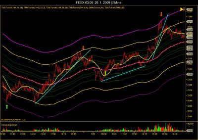 Ahojte kolegovia, toto nieje vlákno pre FESX tak skutočne poslednýkrát tu píšem ohladom tohto trhu. Bolo by dobre založiť vlákno pre Eurex , lebo si myslím že b to bolo užitočné pre všetkých. Tak ako Atlas píše aj mne viac vyhovuje obchodovat celodenný trh, ktorý už začína ráno a je reltívne kľudný. Priemerným dlhodobý denný pohyb je cca 580 USD to je pravda, nepovedal som ako obchodujem. Bežne taktiež obchodujem swingy, ale pokial dostanem signál vrchol/dno tak navyšujem na 3-5 kontraktov a tak si vylepšujem bilanciu obchodov. Zaleži na tom , či dostanem signál na žltej, alebo fialovej čiare. Fialová je extrémny bod tohoto trhu a vstupujem hneď, alebo čakám prelomenie trendovej čiary , či prelomenie stredu tunela Ema144 a návrat späť. Pre názornosť prikladám graf na ktorom je systém Tunel Vegas upravený pre trh FESX. Je ešte viac okolností podla ktorých sa rozhodujem, ale to je vec praxe - napozerania trhu. Všetkým Vám prajem úspešné obchody nech už obchodujete čokolvek. Gladiator028