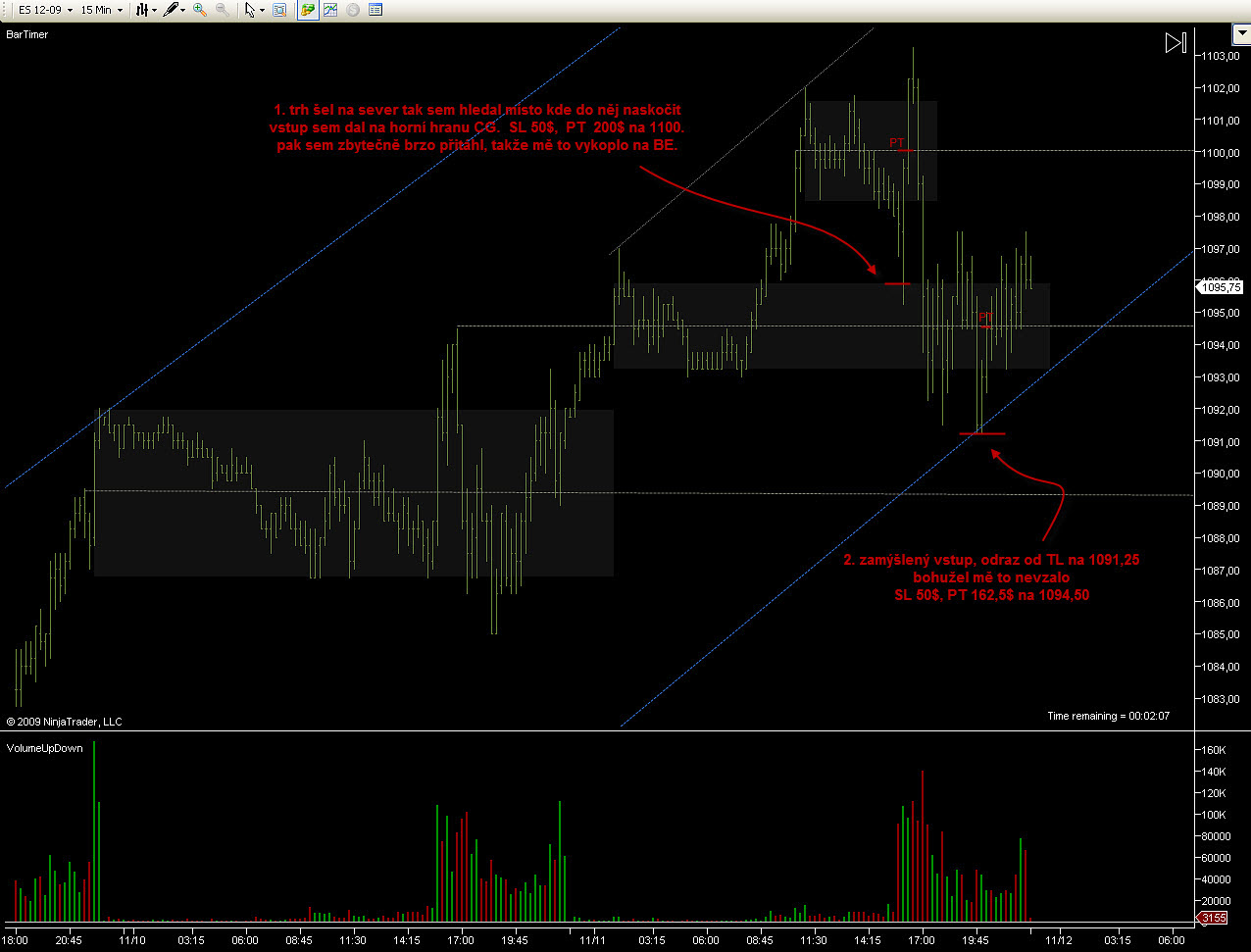 Trh jak kráva :) a nikdo ho tady neobchoduje? Zkusím tohle vlákno trochu oživit a snad se někdo přidá. Ahoj Galdiatore, většinu z toho, podle čeho teď zkouším obchodovat se snažím naučit od Tebe. Přikládám obrázek a jestli bys byl tak hodný a řekl mi, jestli nejsem úplně mimo mísu. Ten prví vstup jsem bral z mého pohledu na prvním možným otočení do trendu. Když na to teď koukám tak nevím, jestli to nebyl až moc velký risk a u druhého vstupu sem zas na pochybách jestli, když se to odráží od TL si nejít pro větší PT. A taky jak řešíš, když Tě to nevezme právě na hranici kanálu, jestli se snažíš ještě naskočit nebo to necháš plavat. Neberu to jako samozřejmost že odpovíš a proto když napíšeš aspoň pár řádků, bude to pro mě hodně znamenat. Obrázek je z 11.11.2009
