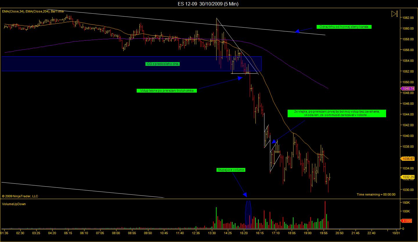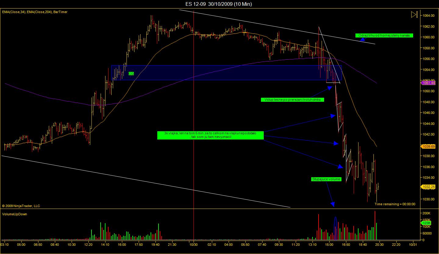pokial si niesi istý vstupom rozhodne nič nepokazíš ak počkaš na hranicu kanala. V prvom prípade si nastupil v strede kanala čo je risk , ale na druhu stranu šlo o formáciu scallop kde sa dá očakávať reverz trhu, avšak musíš tu formáciu identifikovat, alebo musíš nájst pevnu ST hranicu a tam vstupuješ. Trh ES je živší, takže neodporučam pritahovať SL príliš skoro lebo takto zbytočne prichádzaš o zisk. treba si uvedomiť jednu vec a to , že peniaze určene pre SL idú na odpis a tak s nimi musíš zaobchádzať , ak sa o ne bojíš tak o ne aj prídeš. Musíš mať jasno v tom aký profit môžeš očakávat , aby bol reálny a podla toho posuvaj SL napríklad čakaš 200 tak neposuvaj skôr ako máš 100 , to je len model nie pravido, malo by dôjsť aspoń k 50% naplneniu očakaveneho pohybu aby to malo význam. Zbrklým posuvaním SL si sám vyčistiš účet skôr či neskôr. Teda ak dáš do "banku" 100 USD tak ich tam nechaj počas celej "hry" a neodchádzaj od stola ako vystrašený zajac ...nič vo zlom.