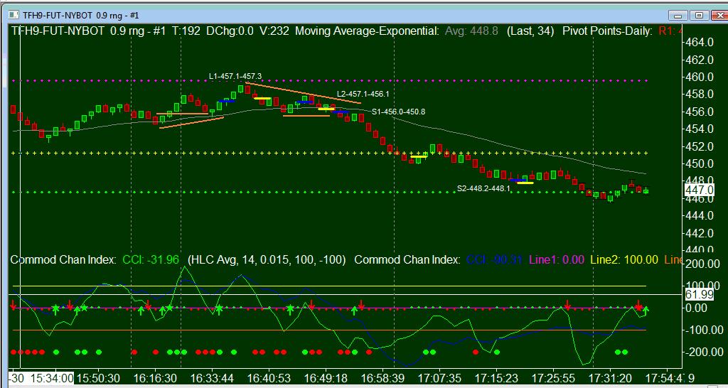 Zdravim, Skusim popisat, na zaklade coho sa snazim obchodovat. Pisem snazim, lebo moja disciplinovanost je stale velm vzdialena tomu, co si predstavujem, ze by mala byt. Obchodujem TF (mini Russell2000) a RangeBary 9tickov. Odkukane od uzivatela danek prave v tomto fore PriceAction. Vyskusal som, tempo mi vyhovovalo a tak som pri tom ostal. Vstupujem limitnymi prikazmi, takze trh mi obcas ujde a potom robim hlupost, ze sa snazim trh nahanat. Market prikazy su momentalne na TF naozaj nepouzitelne, ako pisali skusenejsi v inom fore. Ked som ich pouzil, tak som bol exekuovany aj so slipom 4ticky. Vystupujem podla mojej interpretacie Mplay-ovho vystupu 123, ako je popisany v poslednej knihe Petra a Tomasa „Jak se stát intradenním finančníkem”. Takze ak ide CCI14 proti mne 2x a zaroven je druha sviecka proti mne (ak som long tak cervena, ak som short tak zelena), tak vystupujem. Niekedy ale len posuniem stop-loss 1 tick pod predposlednu sviecku v mojom smere, to podla toho, ako rychlo trh bezi. Trend rozpoznavam na zaklade manualu, ktory bol tiez v tomto fore niekde na zaciatku. Asi to bolo nazvane bubbleho manual, alebo tak. CCI14 a CCI50 zakreslene dole v grafe mi davaju info o momente. V podstate sa snazim obchodovat len 2v signal (ak som ho spravne pochopil z tej knihy) a ten je zakresleny sipkou a obcas spravim obchod podla toho, ze CCI50 preraza 0 a CCI14 +-100. Tie farebne bodky dole na grafe CCI mi davaju informaciu o tom, ci sa CCI14 a CCI50 pohli „skokom”. To mam definovane tak, ze CCI14 sa musi pohnut aspon o 30 bodov a zaroven CCI50 o 15. Farebne bodky okolo nulovej ciary mi davaju info, ci CCI50 stupla alebo klesla. Pouzivam to preto, ze mam maly monitor(notebook) a tak tu modru ciaru CCI50 niekedy neviem rychlo odhadnut. Takze teraz k popisu grafu. Modra ciarka znamena vstup do obchodu, zlta vystup. L znamena obchod bol long (S short), nasledujuce cislo poradie obchodu v ten den do tej strany. Dalsie cislo vstup dalsie vystup. V grafe platna je ta sviecka, ktora je v strede modrej / zltej ciary a vzdy vstupujem / vystupujem podla close sviecky. Obchod L1 - vstup podla odrazenia tesne nad predchadzajucou dolinou. Tusim to je v bubbleho manuali nazvane creeping (plaziaci sa) trend. Navyse to zaroven vytvara vyssi low swing, ako bol predchadzajuci swing a dole sa objavila zelena sipka - vystup podla 123, ale nedodrzal som ho presne, inak by som mal vystupit o cca 3 ticky vyssie Obchod L2 - vstup na zaklade velmi podobnuch uvah ako pri L1, ale nahanal som trh smerom hore. Zelena sipka dole bola totiz ukazana o sviecku skor, takze som mal tiez vstupovat o sviecku skor. Nezvladol som to vsak a zbytocne vahal a ked som sa rozhodol vstupit, tak uz bol trh vyssie. - vystup bol negativne poznamenany vstupom. Podla mojich pravidiel som mal vystupit hned na prvej cervenj sviecke, lebo sa dole objavila cervena sipka, co je signal do protitrendu. Kedze som vsak chcel mat pravdu a nezavriet obchod so stratou, tak som alibisticky pockal na vystopovanie. (to nie ja, to ten zly trh za to moze ) Obchod S1 - vstup je na zaklade preraznia CCI14 hodnoty 100 a CCI50 hodnoty nula. Navyse zaroven cena preraza low posledneho swingu. - vystup = dodrzanie Mplayovho 123 Obchod S2 bolo kliknutie z nudy, ale som si to hned uvedomil a nastastie zavrel Potom sa tam objavil este jeden pekny signal do shortu, ale prave som vykecaval s manzelkou Moje obchodovanie je teda zalozene na tom, ze som nieco nacital, okopiroval kde ma co zaujalo, otestoval, aby som v to mal doveru a skusil. Som zvedavy, ako to pojde dalej.