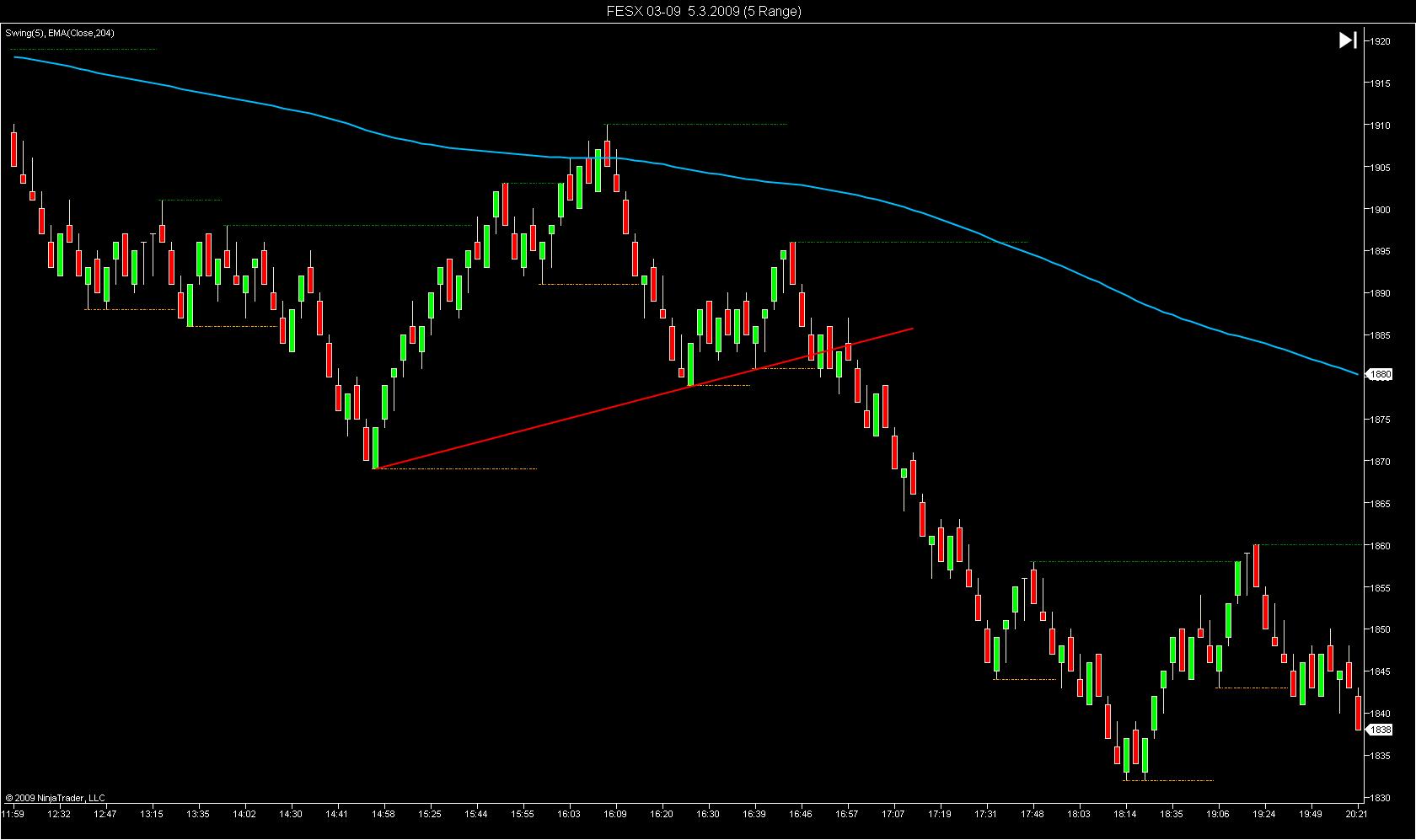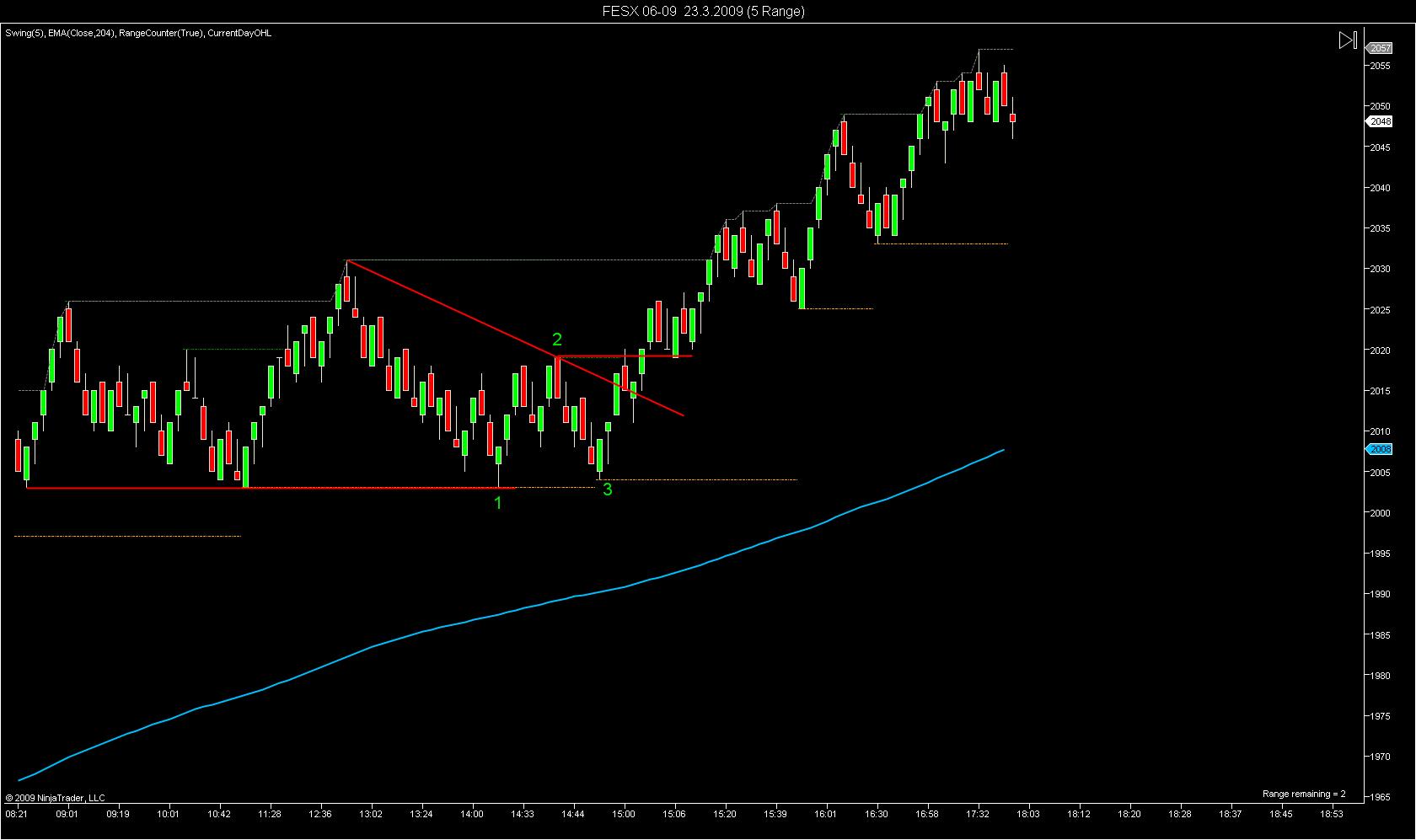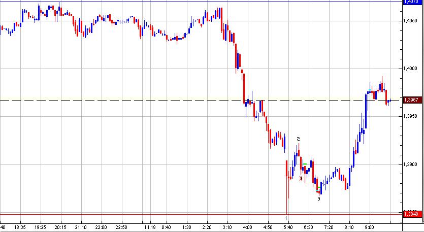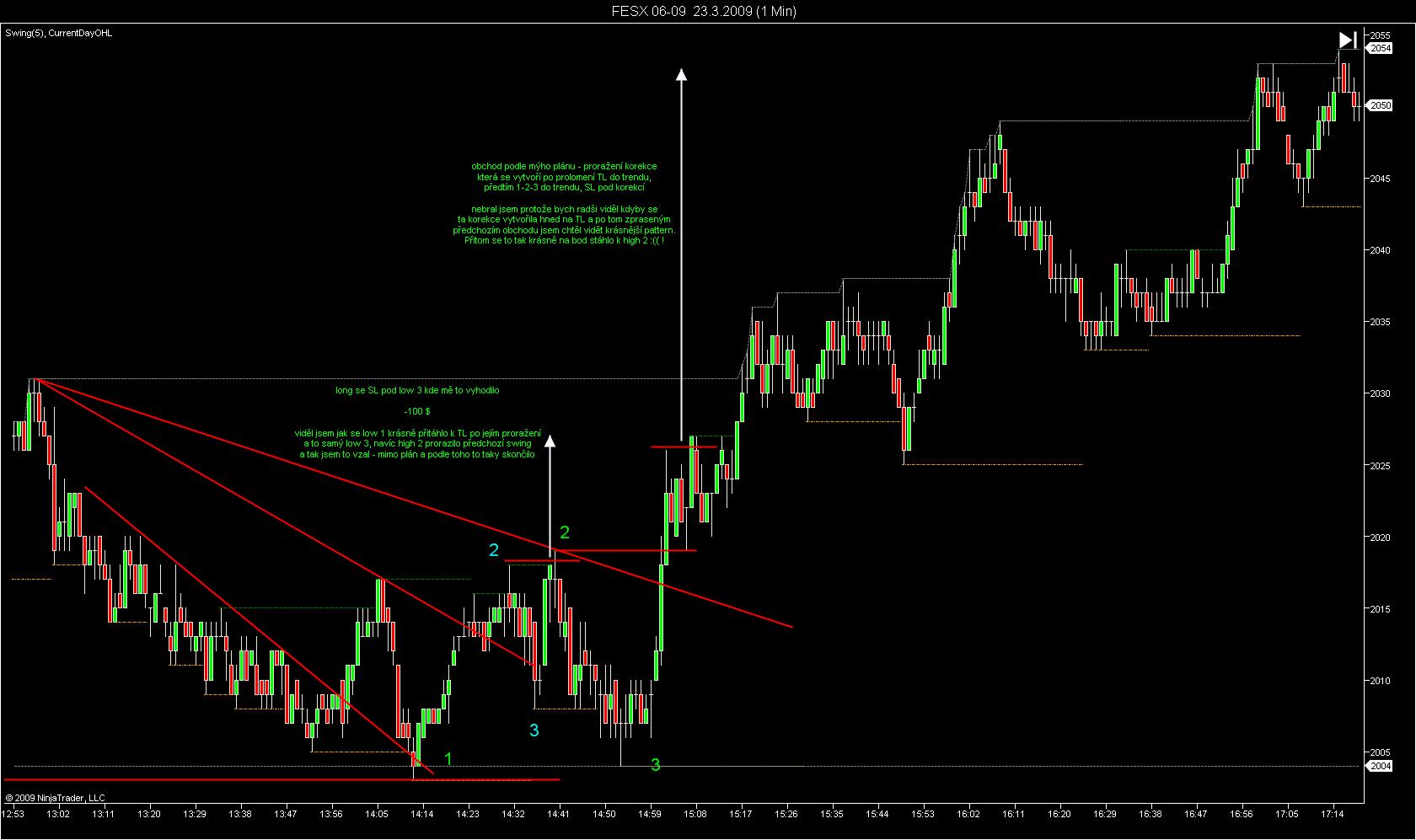 Konečně jsem se prokousal tímto fórem na poslední stránku. Bylo to opravdu poučné. Sim jedu čtyři měsíce u CMS, pak jsem si dal měsíc pauzu (moc se nevedlo, jsem asi 500 pips v mínusu). Rozhodl jsem se sem dát občas některý obchod, třebas si někdo ze zkušenějších všimne, co bych mohl zlepšit CABLE, SIM, TF 5min 1 03/18/2009 06:49:42 24619220 GBPUSD B 1 1.3902 03/18/2009 06:15:08 1.3872 ($300.00) StopLoss 2 03/18/2009 08:57:44 24619640 GBPUSD B 1 1.3875 03/18/2009 06:53:57 1.3975 $1,000.00 Close 1) 1-2-3 na low, bohužel uspěchaný vstup, pravá noha nebyla ve skutečnosti utvořená. Na TF 30min evidentně ukončena 5. vlna EW zasloužené SL (-30 pip) 2) ta samá situace, jen po utvoření pravé nohy. Otevřeno na vedlejší svíčce, než byl ukončen předchozí obchod, ale měl jsem dle pravidel počkat ještě minutu na close svíčky uzavřeno ručně (+100 pip)