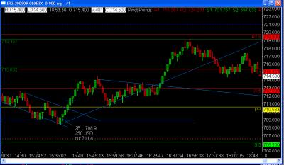 Vkládám graf s obchody ze 17.7.2008 1) Long na základě DB vstup 689.1, výstup na pos. SL 691.8 +270$. Volnější SL by zde byl výhodou. 2) Short, vstup DT na hodnotě 692.3 Trh dlouho váhal, potom se vydal na opačnou stranu. Výstup na SL -140$ (slip) 3) Long, vstup na S/R 692.1, pouze díky předchozí strátě. Za normálních okolností bych v žádném případě nebral. No a jak to bývá v podobných případech výstup na SL -130$ (opět slip). 4) Short vstup 689.7, na DB, trh se ovšem otočil takže výstup BE+1 5) Short na základě pěkného RR, hodnota 687.8, výstup na pos. SL 687.1 +70$, R0.5 nebylo bohužel dosaženo 6) Long vstup DB hodnota 683.3, výstup na R0.5 685.6 při druhém ataku zhora +230$. Opět volnější SL a trpělivost by zvítězily. Celkem +310$ na kontrakt S pozdravem Richard