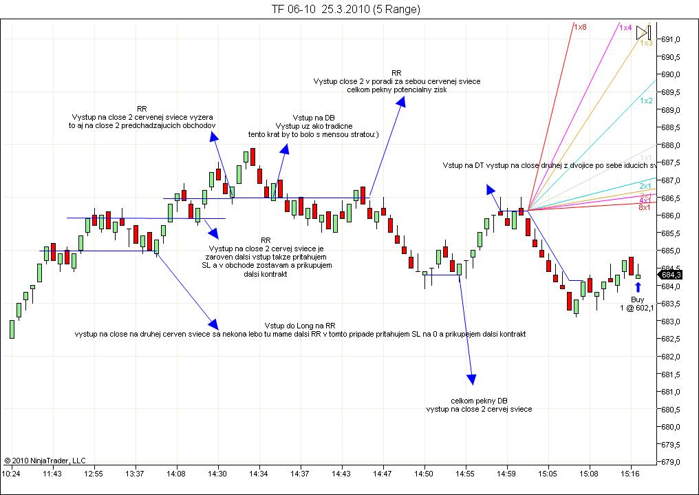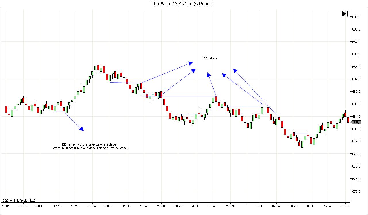 Tak prikladam dotatocne moj prvy a zatial myslim aj dost na hrubo zostaveny obchodny plan ale som rad ze uz aspon na niecom pracujem :) Takze pre vstup pouzivam [bold]DT/DB a RR [/bold] [bold]DT/DB [/bold] [ital] Vstup mam predbezne definovany,ze formacia sa musi skladat minimalne z 2 sviec v kazdom ramene a druhe rameno paternu nemoze byt vacsie o viac ako o dva ticky(porovnavam to podla knotov sviec nie podla real body)a nemoze byt mensie o viac ako 3-4 ticky koncov knotov sviec[/ital] [bold]RR [/bold] [ital]Pri odraze davam rezervu tak 2-3tick podstatne je aby kontaktna svieca uzavrela do pozadovaneho smeru,vinimkou je EVENING/MORNING STAR svieca,ktora moze uzavriet aj tesne nad/pod hranicou odrazu.Vstupujem na close prvej sviece po odrazeni [/ital] [bold]Vystupy mam jednotne pre vsetky paterny a to na close druhej z dvoch po sebe nasledujucich sviec proti pozadovanemu smeru [/bold]