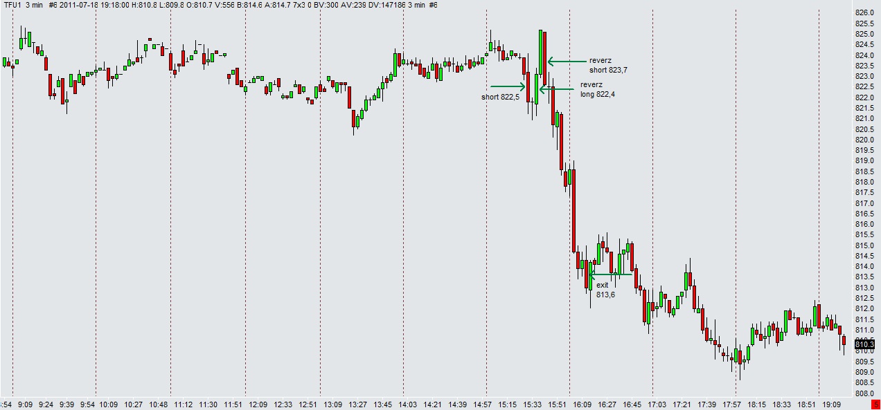 Zdravim Jim, z meho pohledu jsi sice dal screenshot 3tf na forum s vyznacenymi pozicemi, ale samotne casovani obchodu bylo jeste dle minimalne 1tf a celkoveho prehledu o trhu z pravdepodobne 30tf. Na 30tf byl videt klesajici trend a zretelne TAG, zaroven s/r na 820,20. Na 1tf se objevil Rh po prurazu TR z premarketu a pravdepodobny pt byla hodnota kolem 820,50$. Na poklesu se u 3tf objevila svice doji, pritahl jsi tedy SL nad jeji high a pravdepodobne i vstup revers se stopem pod touto svici. Vystup z teto reverzni pozice mohl byt bud pod low druheho reversniho baru na 1tf nebo open price. Do te velke pozice short vstup: TAG na 3tf, pruraz open price, a 1,2,3 na 1tf, potom jsen cekat az cena prorazi silnou s/r na 820,20. K nacasovani vystupu mohl hrat fakt delky pohybu, male 1,2,3 na 1tf a zahustena oblast spolecne s reverzni svici na 3tf. Po techto signalech k vystupu mohla byt obava k navratu ceny k hodnote 815,40. Ja pouzivam jeste 10tf v oteviraci dobe trhu a dayli OHLC predchoziho dne + aktualni dayli oteviraci cena. Tolik muj nahled. Jinak mas skvely napad jak ostatni primet premyslet a ne vse nosit na stribrnem podnose. Muj problem: vydrzet po vstupu na stanoveny PT.