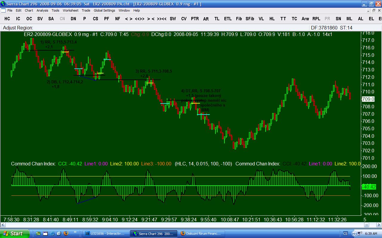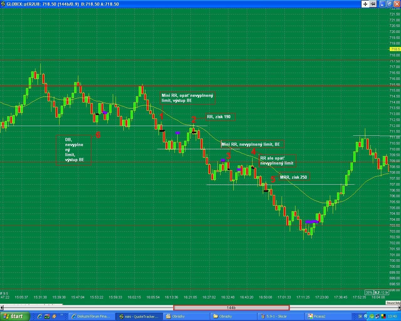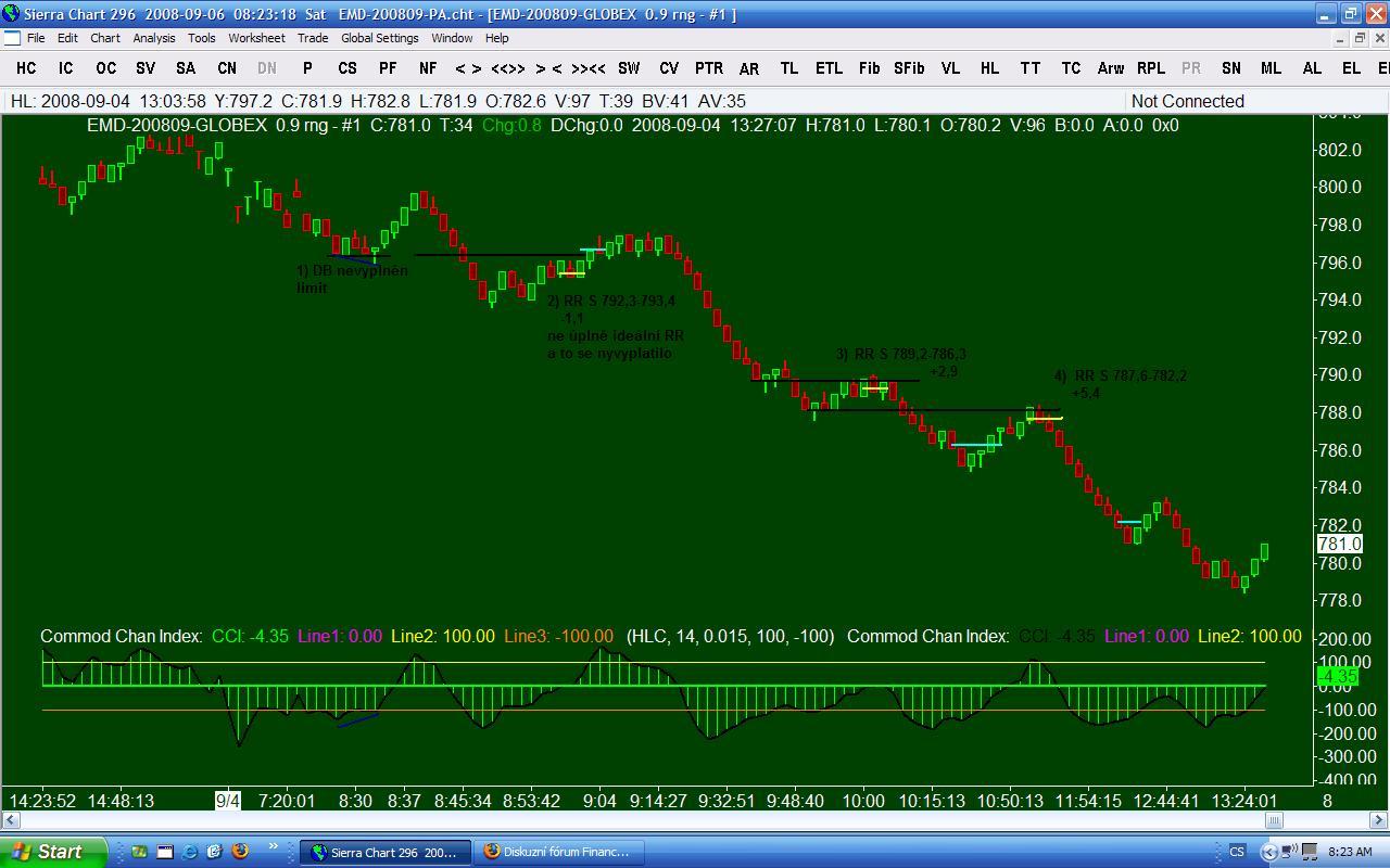 Ahoj všichni Chtěl bych se zeptat zkušenějších traderů jak by posoudili následující situace: -modře jsou zakresleny případné vstupy 1)podle mě krásný DB, bohužel by skončil ztrátou, brali jste ho? 2)šel by brát jako 2br? 3)krásný DB 4) DT? Pokud bych vstoupil v bode 3 do Long pozice a nyní bych dostal signál na Short, vystoupíte z Long a uděláte reverse nebo přitáhnete těsněji Sl nebo lépe filtrujete? 5)RR, platné? viz. bod 4 6)DT, brali by jste ho? viz. bod 4 Doufám, že to zajímá víc lidí. Chtěl bych taky moc poděkovat hlavne Dankovi, Oukledovi, Remarqovi a taky hodne Jkr za jejich posty. Přeji hezký víkend :) Ota