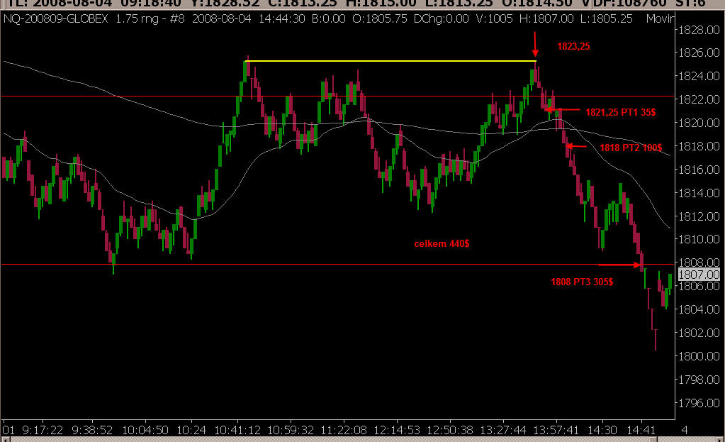 Napadla mě jedna zajímavá myšlenka ohledně PA, zatím jsem se na to koukal jenom tak hoďku, co kdyby se k obchodování přístupovalo takto: 1) Podívám se na předcházející den, zakreslím si S/R na H a L dne a pár S/R, které byly opravdu výrazné, max. tak 2 at se to neplete. 2) Budu vyčkávat na hezké DT, DB, 2bR, 1-2-3 na těchto S/R 3) Pojedu např. NQ s RB1,75 SL vč. komisí 50$ Vstup se 3 kontrakty PT1 bude na 2 bodech (35$ vč. komisí), ostatní dva kontrakty jdou na BE. PT2 dám dle MFE analýzy na nejvýhodnějším bodě, nyní (5,25 bodů - 100$vč. komisí) PT3 Už dle situace, např. nechat to dojít k další lajně, kterou jsem si zaznačil, případně nějaký hodně vzdálený profit. Koukal jsem na to na NQU8 za červenec. Například u Low minulého dne se vytvořilo DB, PT1 tedy 35$, PT2 100$ a PT3 jsem nechal dojít k předchozí nejbližší lajně (480$), dokupy tedy 615$
