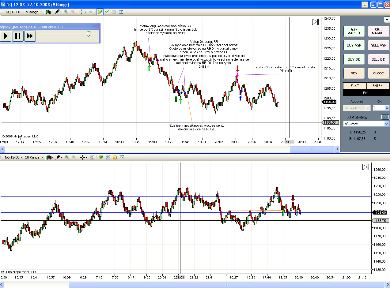 Zdravim Dnes vecer jsem mel cas, tak jsem si udelal replay z 27.10. K systemu: Hlavne se ridim grafem RB 20, na kterem si zakresluju SR z minuleho dne a pak z prubehu dne. Vstupuji na odrazu od SR a na RR.Vstup uz je na RB 9, jakmile se utvori svicka do meho smeru.