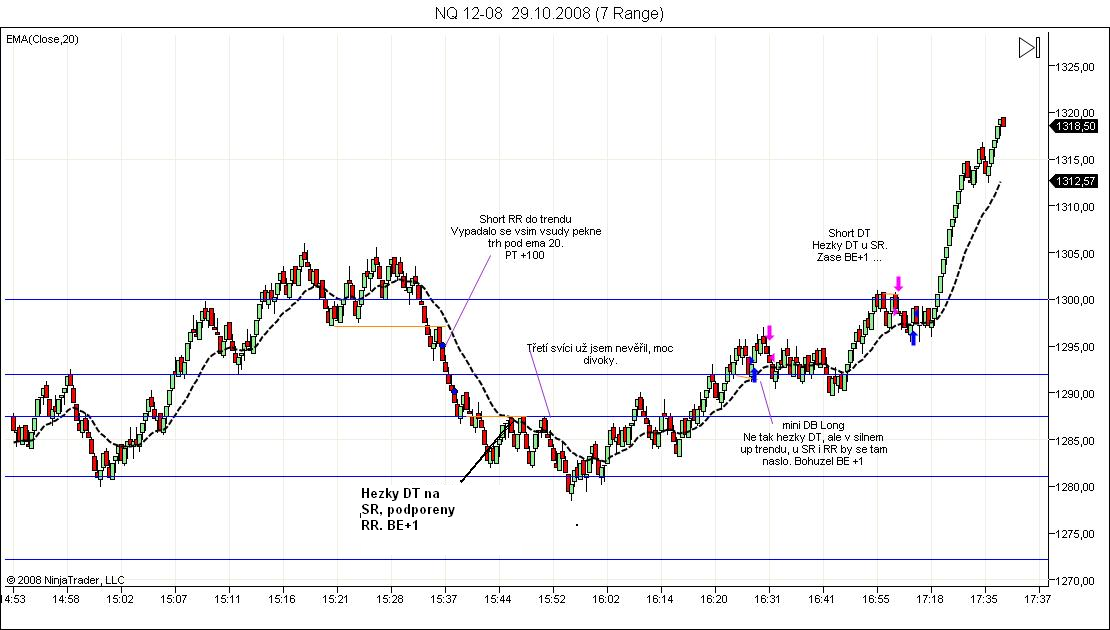 Ahojte Dnes vecer jsem konecne dokoncil serii maturitnich otazek, tak jsem se mohl opet vrhnout na grafy :). Pustil jsem si replay z 29.10 a jel jsem ciste formace DTB/RR bez vyssiho TF. Dopadlo to velmi pekne, 4 obchody bez SL. 3xBE+1, 1xPT.