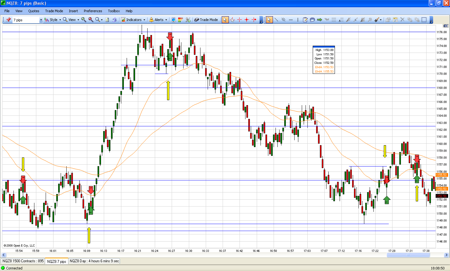 ahoj, dnešní obchody.je to pro mě druhý den na RB7 NQ . (uter., stred. jsem neměl čas) žlutý šipky = vstupy , modrý čáry = S/R 1. trendDT-žádná krása, ale doufal jsem že to dojde na S/R - PT 5,25b přesně na tick 2. protiDB - pro mě hezky, od S/R - PT 5,25b 3. trendDB - blízko high dne,po velkém longu - asi nebyl ideální - trh šel do strany posunul jsem na B/E+1 (což jinak nedělám - jen v těhle situacích) 4. trendDT - myslel jsem že doleze k tomu low - SL 2,25b 5. trendDB - trochu nerozvážně, nehezký signál,za chyby se platí - SL 2,25 celkem +5b. dojmy z obchodů: ze SL si hlavy nedělám, ztráty jsou součástí a vyhnout se jim nedá. dneska mám radost ze sebe, že jsem si vybíral a nedělal žádná emociální rozhodnutí..RB7 my docela vyhovuje,protože je to takové živé, drží si to mou pozornost a mě trading baví, takže jedině dobře.hezký večer přeje nojgič