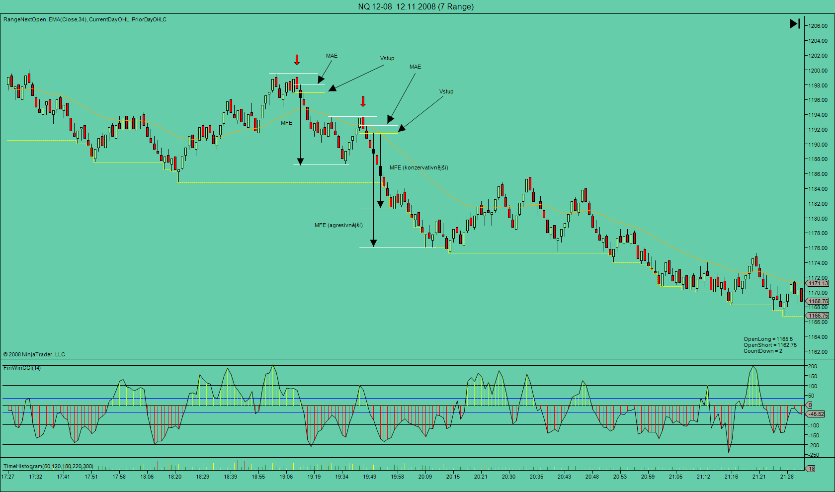 mima: Pokud jde o MAE a MFE, tak MAE je po vstupu strikně dané pohybem proti tvé pozici. Pokud jde o MFE, tak to už je čistě individuální záležitost. Záleží na tom, jestli si konzervativnější nebo agresivnější trader. Přikládám obrázek, kde jsem označil dva vstupy a zakreslil, jak bych si já u nich zapsal MAE a MFE. mira_k: Víš jak, na mrtvém grafu je člověku všechno jasné :-). Měl jsem předpokládat spíše tu horší variantu a to, že se to od té S/R odrazí. Tohle si ale neříkám, když vidím, že trh jí prostě dvakrát projel nahoru a dolů. Potom si říkám, jestli to je platná S/R nebo ne. Každopádně to RR, které se tam vytvořilo bych určite nebral. Tohle vůbec nemám rád a mám to i jako podmínku a to pouze jeden průjezd S/R. Pro mně hezký příklad tohoto je RR na konci dne.
