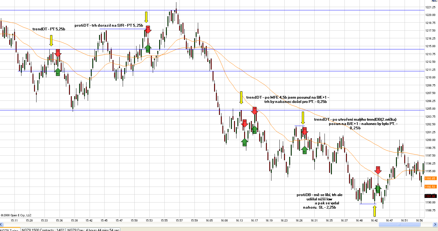Takze prikladam svoje dnesni obchody. Dneska to bylo o poznani veselejsi. K trhu jsem sednul o neco drive, abych si udelal dukladnou pripravu. Zacal jsem pred pul sedmou. Nejdrive jsem myslel, ze budu pouze sledovat trhy, ale potom jsem z treninkovych duvody zacal do signalu vstupovat. V podstate za tu hodinu a pul bych byl v dost velkem profitu, kdybych se drzle planu, ale tohle jsem bral vylozene jako trenink a zkousel si jine veci. Vysledky jsem nezahrnul do deniku. Od 20:00 jsem to uz bral seriozne a maximalne zodpovedne. Rekl jsem si, ze udelam 5 trejdu, at budou jakekoliv. Na zacatku jsem chytl dva SL, ale pokracoval jsem dale. Nakonec jsem skoncil po 5 trejdech + 15.00 b. Co jeste dodat. Zjistuju, ze vysledek trejdingu hodne ovlivnuje moje vnitrni rozpolozeni. Ve stredu a ctvrtek jsem uz pred zacatkem citil nervozitu a taky to podle toho dopadlo. Dneska jsem se citil prave naopak. Byl jsem si jisty sam sebou a taky to, ze to pujde dobre a skoncim v profitu. Ani prvni dva SL me nijak nerozhodily a pokracoval jsem v klidu dal. Rozbor vsech vstupu i signalu, ktere jsem nevzal jsou opet v prilozenych obrazcich. Snad to bude pro nekoho uzitecne.