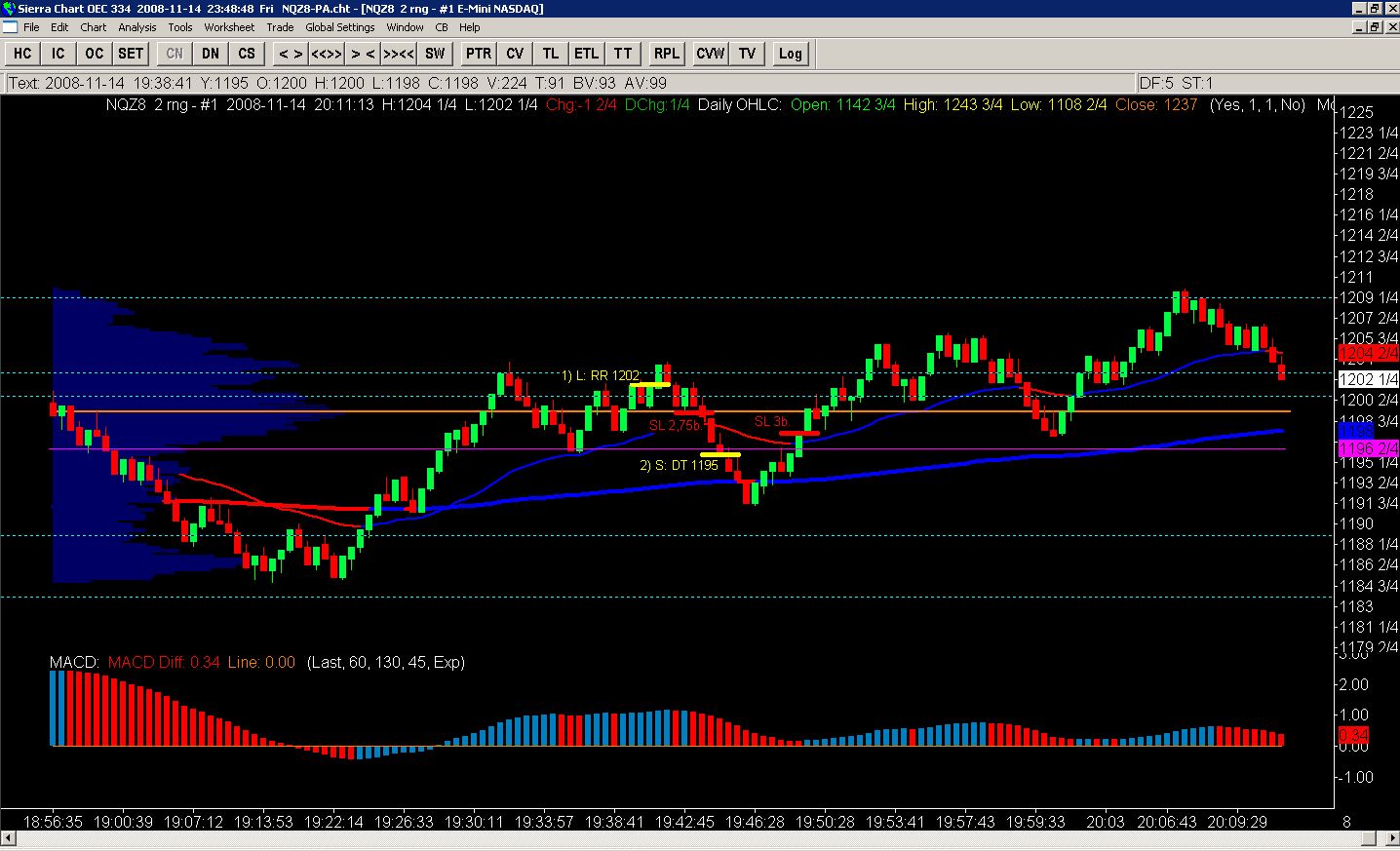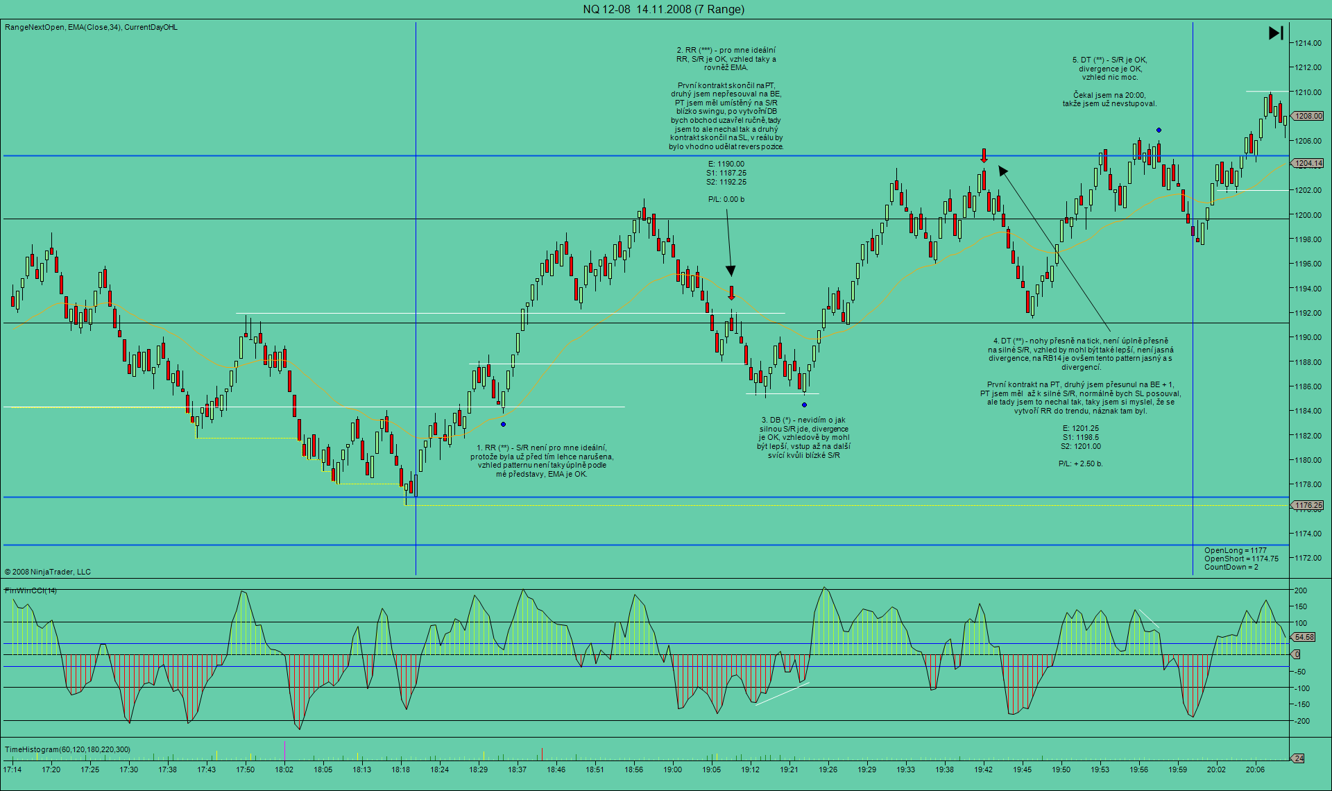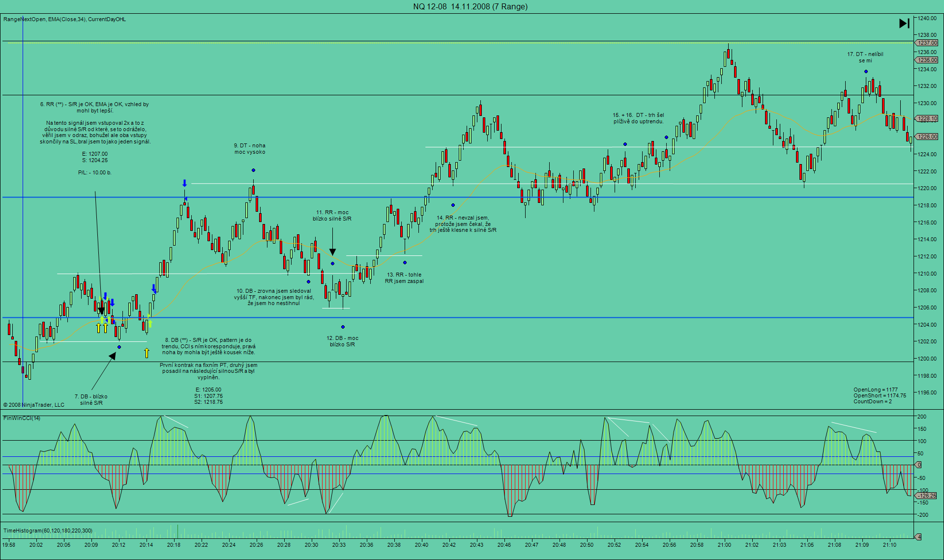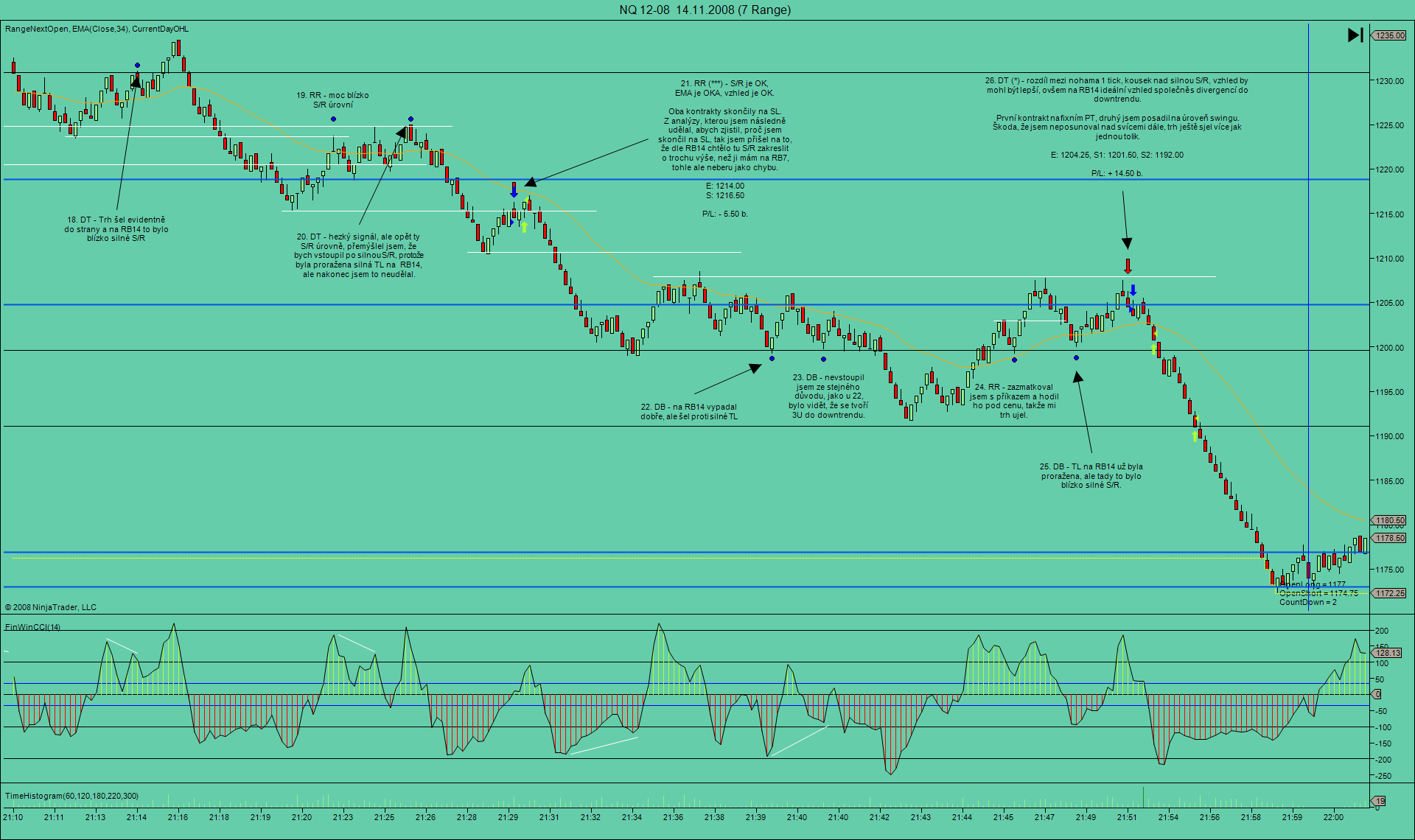Zdravím, moje dnešní obchody. NQ, RB2, sim (2xSL) 1) RR, dle mého pěkně do trendu, po druhém odrazu od PP, ale zastavila ji S/R, z předchozího vrcholu 2) DT, vstup na predchozi korekci po prurazu PP, s podporou divergence CCI(14) na RB6, podle mne v pořádku vstup, ale trh by proti :) Pak jsem to zabalil a šel dělat něco pořádnýho, tedy montovat dětskou postýlku :) takže jsem týden sim zakončil neslavně, ale celkově jsem s týdnem spokojen, jen tak dál (tu) btw. pokud budete mít kdokoli k mým obchodům připomínky, tak sem s nimi, budu jen rád. ať se daří, Míra