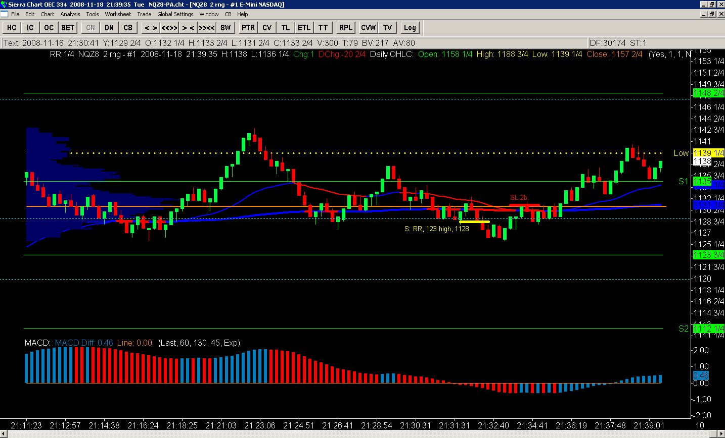 Zdravím, moje dnešní obchody. NQ, RB2, 19:30-21:30, 2xSL,1xB/E, live 1) DB, dle mého pěkný DB na S1,5, podporeny reversem MACD-H, ale k PT nedošel, výstup na B/E+1 2) RR, sice do trendu, pod S1,5, kterou před tím 2x otestoval zeshora, ale i tak neměl sílu na proražení low ... tenhle vstup jsem hodně váhal, protože mi připomínal moje dva SL z předchozích dvou dní, ale zde jsem vzatl v potaz, že zlomil DB a S/R, výstup na SL 3) RR .. tady moc nevím, jak to okomentovat, z nějakých důvodů jsem viděl 123 high a vstoupil na korekci, leč blbě, výstup na SL, tohle byla jednoznačně moje blbost a asi pokles soustředění a morálky, když mi předtím utekly dva obchody ve 21:09 a 21:21, obojí RR, které jsem zvažoval, ale tak dlouho, až mi utekly. ať se daří, Míra