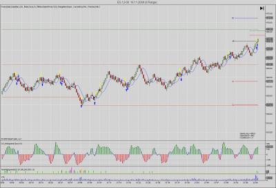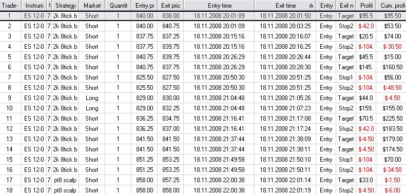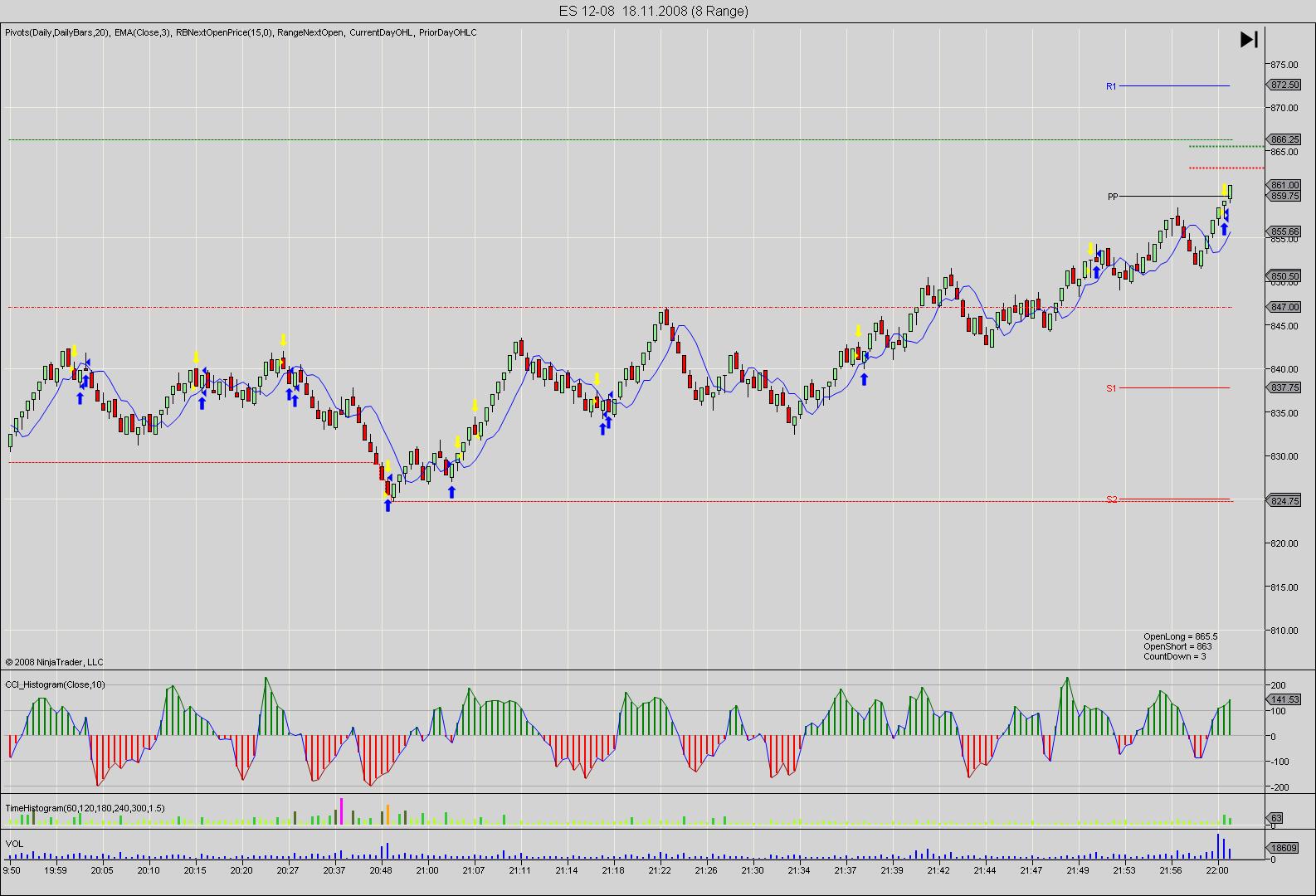 Tak po delší době taky přihodím grafík. Nic moc, na ES, RB8 a některé vstupy na RB4 (bohužel u toho plného SL na obou kontraktech - 4. obchod - jsem tam lezl jen na tom RB4 bez signálu na 8 a to byla velká chyba). První trade ještě OK. Druhý nic moc, ale fajn. Třetí dobrý. Takže +160 USD celkem. Teď jsem toho měl nechat. Jenže pak začal krásnej short a já začal pátrat, jak do něj naskočit. Když jsem si konečně našel důvod na RB 4 proč tam vlézt, udělalo to v tom směru už jen jeden tick a tradá na plnej SL. rima, takže opět v mínusu. Pak jsem ale vychytal DB a vlezl tam dobře. Jenže jsem moc "utahoval". Výsledkem je, že z obchodu s potenciálem cca 600USD jsem dostal 160USD. Pak dva úplně blbý obchody, který ale ve výsledku velmi mírné +. V té chvíli jsem toho už chtěl nechat, že budu alespoň trochu v plusu a dobrý. Hmmm ... jsem hamoun, nedalo mi to a profit vrátil na opět zcela idiotském vstupu, kterým jsem se dostal do červ. čísel. Poslední trade už je jen zoufalý pokus dostat se zpět na nulu a rychle to zavřít. Nepromeškat chvíli před 22:00 nástup shortu, skončilo to ještě úžasně - několika set dolarovým profitem. Takhle je celovečerní snaha odměněna ztrátou 5 USD. Poříd musím pracovat na psychice a nesnažit se honit obchody. Vím to. Přesto to pořád dělám jako idiot. Ach jo. Všechno je to samozřejmě live, paper pro mne nemá smysl, protože jsem v něm bezproblémově profitabilní. Beru signály bez váhání, live mám u některých problém a bohužel se často ukazuje, že nevezmu právě ty profitabilní a pak už mám klikací absťák, pocit, že mi něco utíká a vlezu i tam, kam bych na SIMu neměl potřebu lézt ... je to těžký. No nikdo netvrdil, že to bude lehký ;-) Obchody 1-3 jsou jako DTB, 4 je zcela nesmyslný vstup (bylo to takové mikro RR na RB4), 5 je DTB, 5 RR a zbytek už jen DTB (kromě posledního trade, tam to byl mikro DTB na RB4, kde jsem počítal s tím zavřít to na několika tikách, abych se dostal alespoň na nulu).