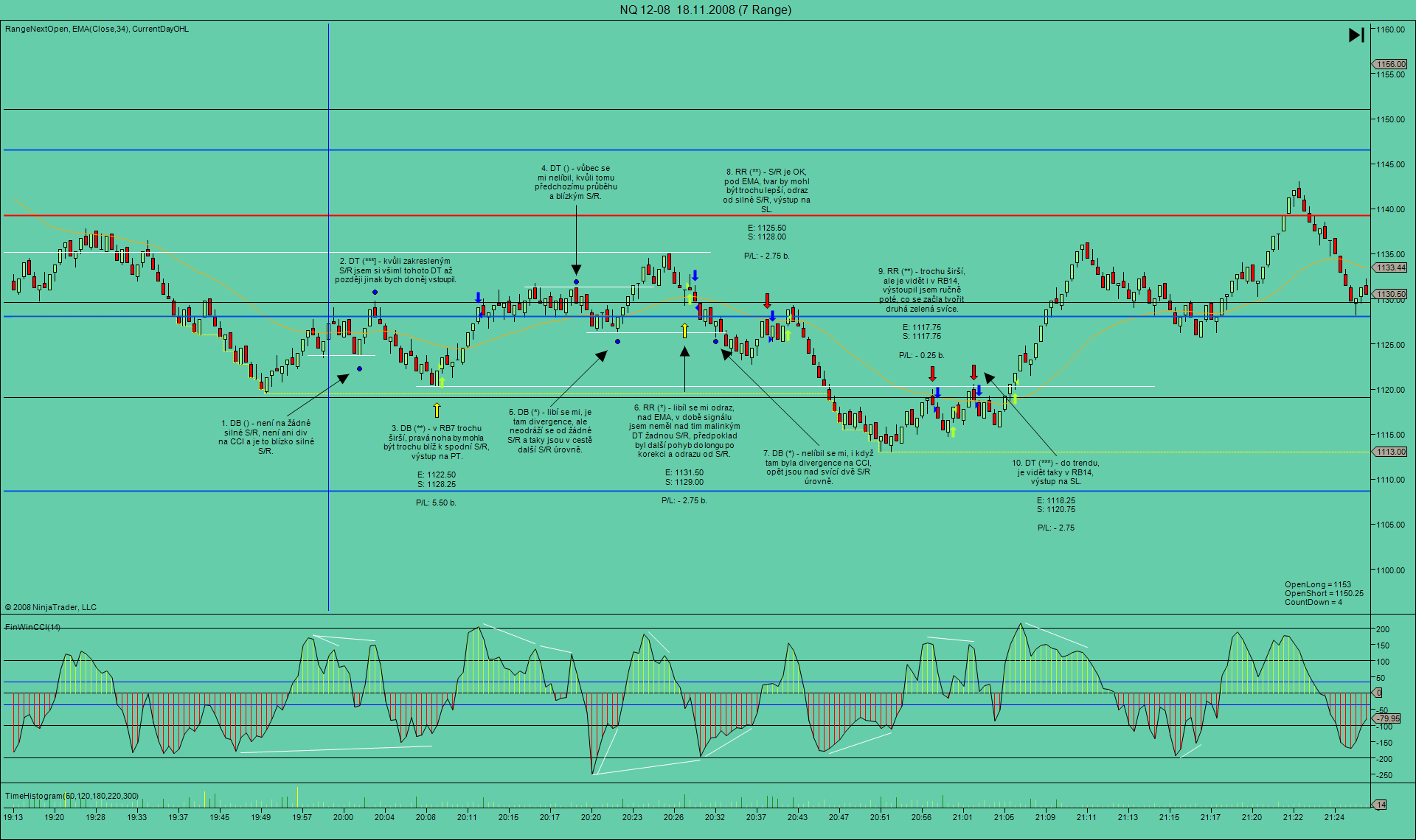 18.11.2008 NQ RB1,75 Nic moc den, sice výsledky jakš takš, ale nebyl to den na hezké signály, proto jsem bral i ty, které nebyly úplně ťip ťop. 1) tam jsem po vstupu chytil gap, v live bych raději po gapu obchod uzavřel. Straší tam ten předchozí vrchol, ale formace byla souměrná, ležela na S/R a byla tam divergence 2) takový nemastný neslaný signál, zase formace nicmoc, ale na S/R + divergence 3) v tomto vidím moc hezkou formaci, bohužel nevyšla. 4) Sice úzké, ale na včerejší S/R, která byla i dnes otestována, + divergence 5) Tento obchod se mi líbí nejméně, kdyby formace nebyla přesně na S/R a přesně na tick tak bych ji nebral.