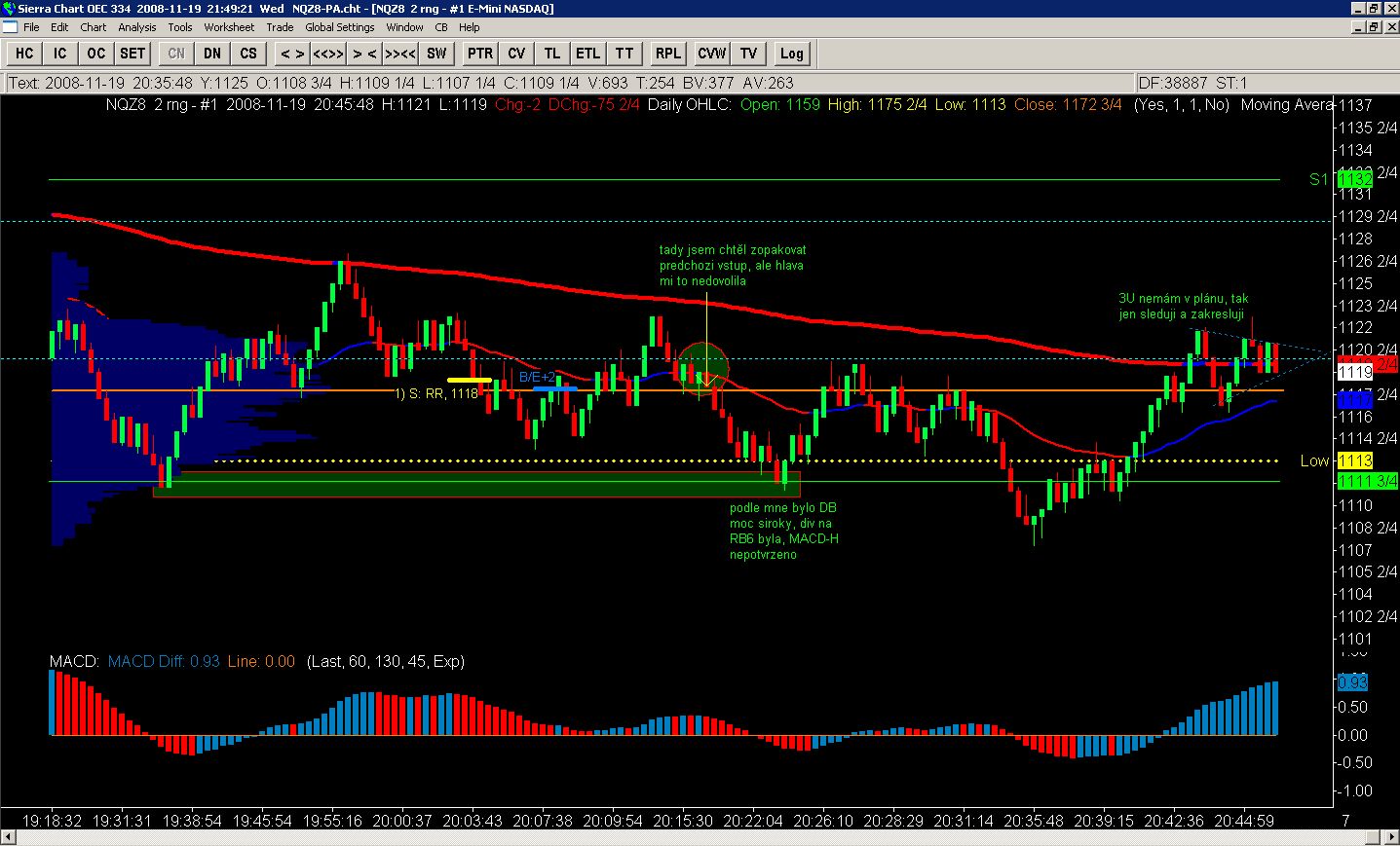 Zdravím, moje dnešní obchody. NQ, RB2, 19:30-21:45, 3 obchody, 2xSL, 1xB/E+2, live 1) RR, podle mne v pořádku vstup, dle plánu, do trendu, že to skončilo na B/E+2 a ne PT je věc druhá, ale s tímto vstupem jsem spokojeny 2) RR, po dlouhé pauze a přání, ať to prorazí dolu jsem se dočkal, dle mého vše nasvědčovalo, že se jedná o správný vstup, pod pod silnou S/R a včerejším low, potvreno klesajícím MACD-H, díky korekci SL 3) RR, prakticky ten samý vstup, ale po dlouhém váhání ceny, zda jít dolu a prorazit low, po prurazu jsem pockal na druhy pokus a vstoupil, bohužel korekce mi trefila SL skoro na tick a pak se rozběhlo "mým" směrem, kdybych počkal na druhý odraz, tak .. ale na kdyby se nehraje, takže SL Začal jsem si do grafu psát i vstupy, které se mi líbily, ale nevzal jsem je, primárně buď díky tomu, že mi to hlava a řada SL nedovolila nebo, v případě 3U nemám v plánu a tam nechci brát, jen sledovat. No, nemůžu říct, že by moje psychika byla na nějak extra dobrý úrovni, nemyslil si, že vstupuji blbě nebo porušuji plán, ale moje chyba je, že jsem snad málo trpělivý a občas přání předběne trh :( Pořád věřím systému, který je dobrý a funkční, jen je chyba mezi židlí a klávesnicí :) Pokud někoho napadne nějaký komentář, tak sem s ním, určitě jsou vítané. ať se daří, Míra