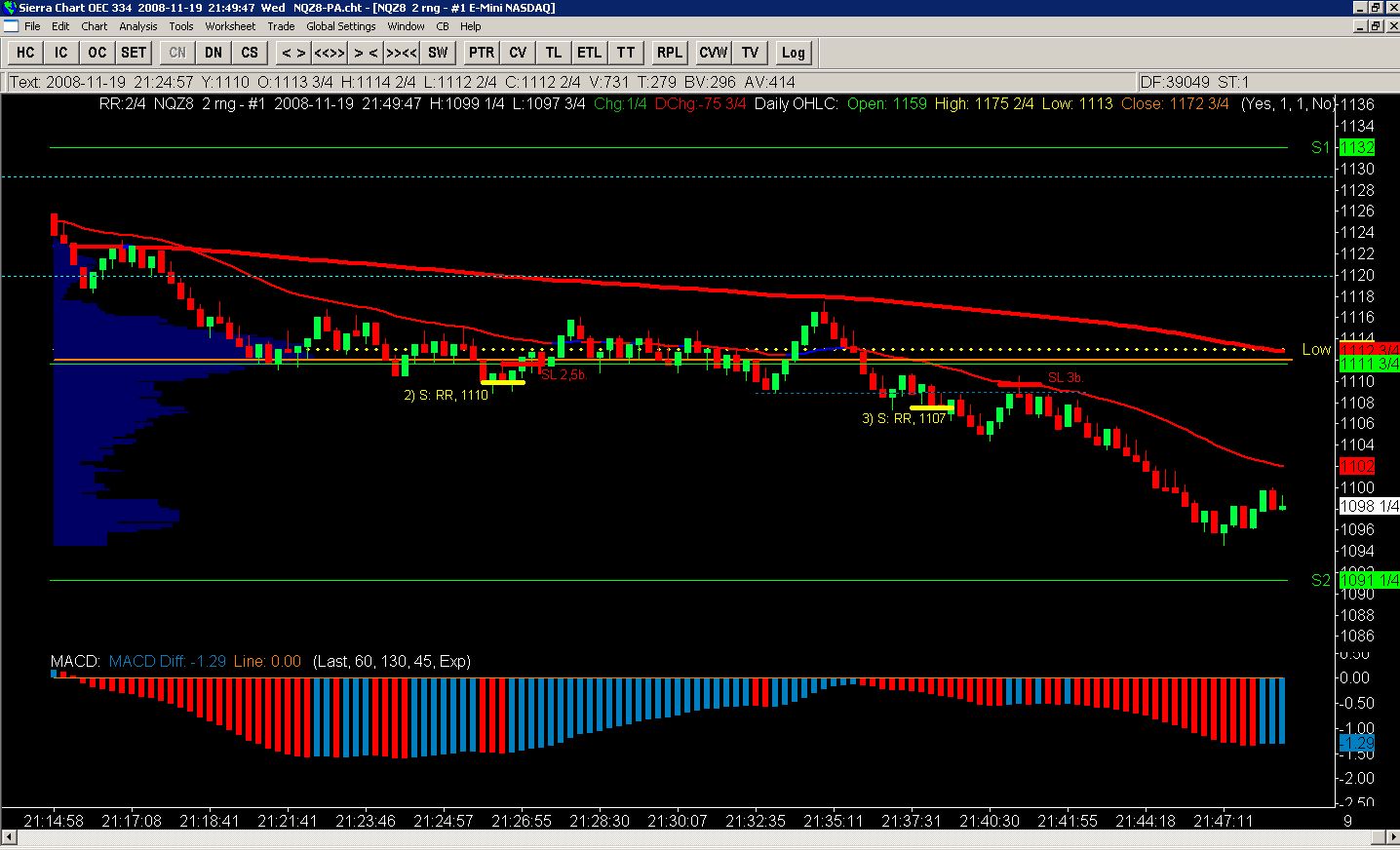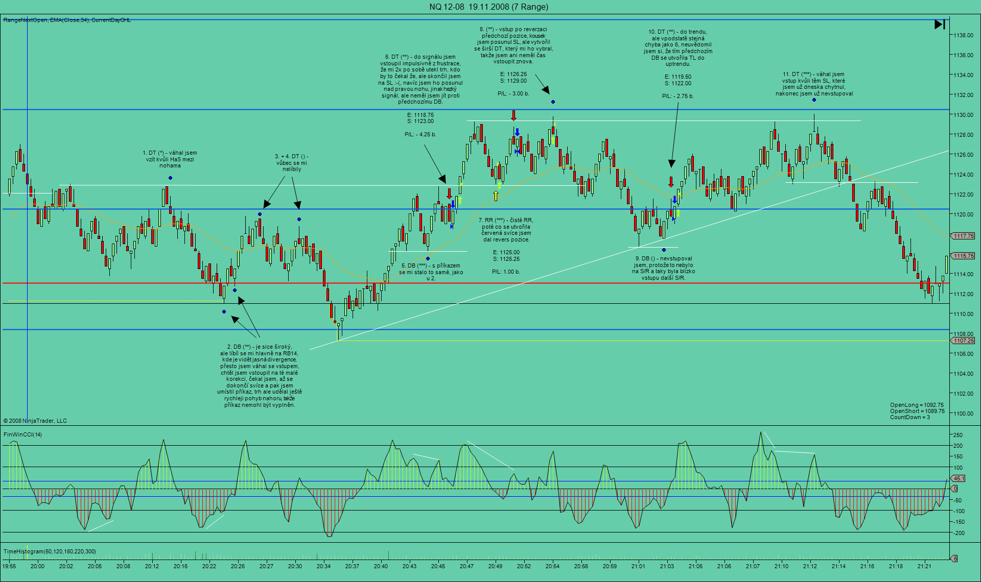 Teď pojedu hlavně V1500, pravidla MM zatím stejná jako u RB, jen s tím rozdílem, že nepolezu tam, kde vstupní svíčka má range větší než 100$. RB pojedu taky, ale tam beru jen ty suprové signály (***) chci vidět krásnou formaci, na S/R a s divergencí. 19.11.2008 na V1500 1) Nic moc signál, zvažoval jsem zda vzít. 2) Trochu široké, ale jinak podle mě hezké trendové DTB, líbil se mi ten přesný odraz, kdyby to nebylo přesné asi bych nebral. 3) Za dnešek asi nejhezčí signál, taky kdyby nebylo tak přesné tak bych ho kvůli širokosti nebral.