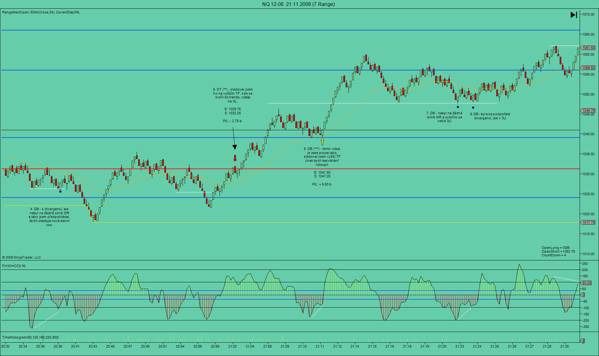 prilozim aj ja svoje obchody za vcerajsok. zatial sa mi nedari dostat ku grafom kazdy den, ale snazim sa. Vcerajsie obchody su od 21:00 do 21:40. Este robim dost vela obchodov, lebo nemam vycibreny cit tak ako by som mal a robim obcas aj hluposti. musim na sebe odstranit impulzivnost. 1. DT - trh po dokonceni rychlo letel dolu tak som nastupil impulzivne az na druhej cervenej, inak bol to pre mna neplatny signal lebo rozdiel vrcholov bol 3ticky a ja beriem maximalne 2, ale nestihol som si to spocitat vsetko: SL -50 2. DT na tej istej S/r podporene divergenciou : PT100 3. nezmyselny vstup, videl som trendove DT tam kde nebolo :) SL -50 4. pekny DT, ale neviem preco mi usiel takze ziadny obchod 5. DB podporene divergenciou. take mam celkom rad ak je medzi nimi aspon dva bary a niesu velmi siroke PT100 6. trendove DT ten obchod tu bral asi kazdy, na mna trochu siroke uz ale dobra s/r a je to na tick presne takze som bral aj ja PT100 celkovo +200