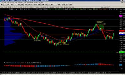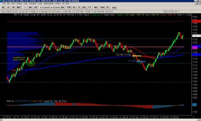 zdravím, moje dnešní obchody. NQ, RB2, 19:45-21:50, 3 obchody, 1xPT, 1xB/E+2, 1XSL, live 1) DB, vrcholy mi sedly přesně na S/R, navíc podpořeno reversem MACD-H, ale trh byl moc rozjetý dolů a tak výstup na posunutém SL na B/E+2 2) RR, tohle už je u mne asi klasický signál, měl bych si to zapracovat do strategie, jako negativní vliv mého systému :) trh hodně zahuštěný, MACD-H na vzestupu, no a já vezmu rádoby odraz dolu, výsledek jasný ... SL 3) RR, trh po opětovném průrazu PP se neměl na další uptrend a MACD-H začalo otáčet, pod TL vytvářel trh pořád nižší High, až jsem vstoupil odrazem od S/R ... výstup bohužel časový PT, protože nechci jít přes 21:50, jinak by byl plný PT Dneska se mi stala zajímavá věc, chtěl jsem vstoupit na RR v cca 21:21 STP 1115, ale prikaz se mi nevyplnil, najednou se mi obejvilo v DOMu čísla cca. 436 a u mého příkazu záporné číslo, které klesalo k nule a pak mi to zahlásilo, že to nemůže vyplnit, že cena je už mimo, pochopitelně, trvalo to asi minutu a trh byl na vzestupu, škoda byl tam plný PT. ať se daří, Míra