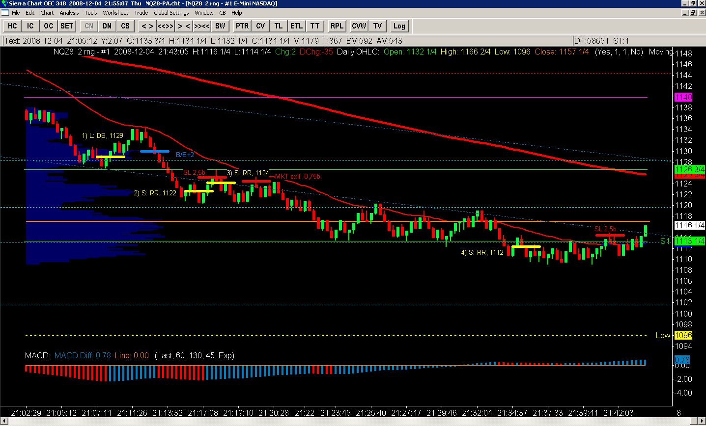 zdravím, moje dnešní obchody. NQ, 19:30-21:45, 4 obchody, 1xB/E+2, 2xSL, 1x MKT exit -0,75b, live 1) DB, podle mne pekný DB na dnu kanálu, navíc "opřený" o S/R a S0,5 + podpora MACD-H, ale nedoslo to az k PT, ale s timhle obchodem jsem spokojený 2) RR, vzal jsem odraz od dna kanálu, po prorazní DB, ale byla to pěkná blbost, taky to podle toho dopadlo .. SL 3) RR, totožný vstup jako 2), jen s odrazem od S0,5, myslím, že vstup podle plánu, ale jak se trh nerozjel hned mým směrem, tak jsem zazmatkoval a vystoupil MKT na ztráta -0,75b ... trh se samozřejmě rozjel a trefil by můj PT :( 4) RR, bral jsem odraz od S1, kam navíc trh pěkně klesal, jako správný vstup, no nebyl ... chvilku se trh "válel" pod S1, aby pak vyrazil nad ní, tj. SL dnes se mi den lámal na obchodem 2) a 3), kdybych blbě nevstoupil do 2), tak jsem byl klidnější a nepoužil MKT na 3) a dnešek by byl úplně s jiným výsledkem, takto opět minus. ať se daří, Míra