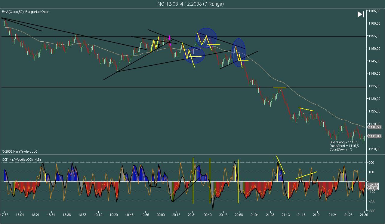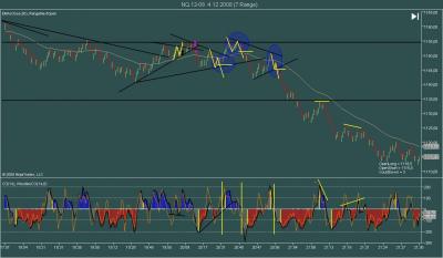 Dnes 4.12. - NQ 15:30 - 18:00 3 live obchody 2xPT , 1xSL 1) trendové DB, pěkně souměrný na S/R hranici, výstup na - PT +100 2) trendové DB, na S/R ale těsně pod *"tou hnědou čárou", což není moc příznivé - SL -50 3) trendové DT, pěkně pod tou hnědou čárou, ramena na tick přesná a divergence - PT +100 celkem +150(zaokrouhluji) pocity: byly to moje první dva vítězné obchody, takže takové malé utišení, že to opravdu jde. Den skončil v příjemném plusu, což mě velice těší. Můžu potvrdit to co se všude píše, že trading je opravdu z velké části o psychice. to frame3: drawdown jsem měl samozřejmě větší. v klidu se snažím být, ale nervíky to jsou, však víš nebo teprve uvidíš. každopádně dneska jsem to trochu spravil a zítra pokračujem :) * hněda čára = říkám tomu rangestart , obě hnědé čáry ohraničují rozpětí za prvních 15 min. převzal jsem to od Petra z jeho článku o DT/DB, má pravdu, že trh má s těmito hranicemi během dne problém. teď už mě snad neukamenujete :-p