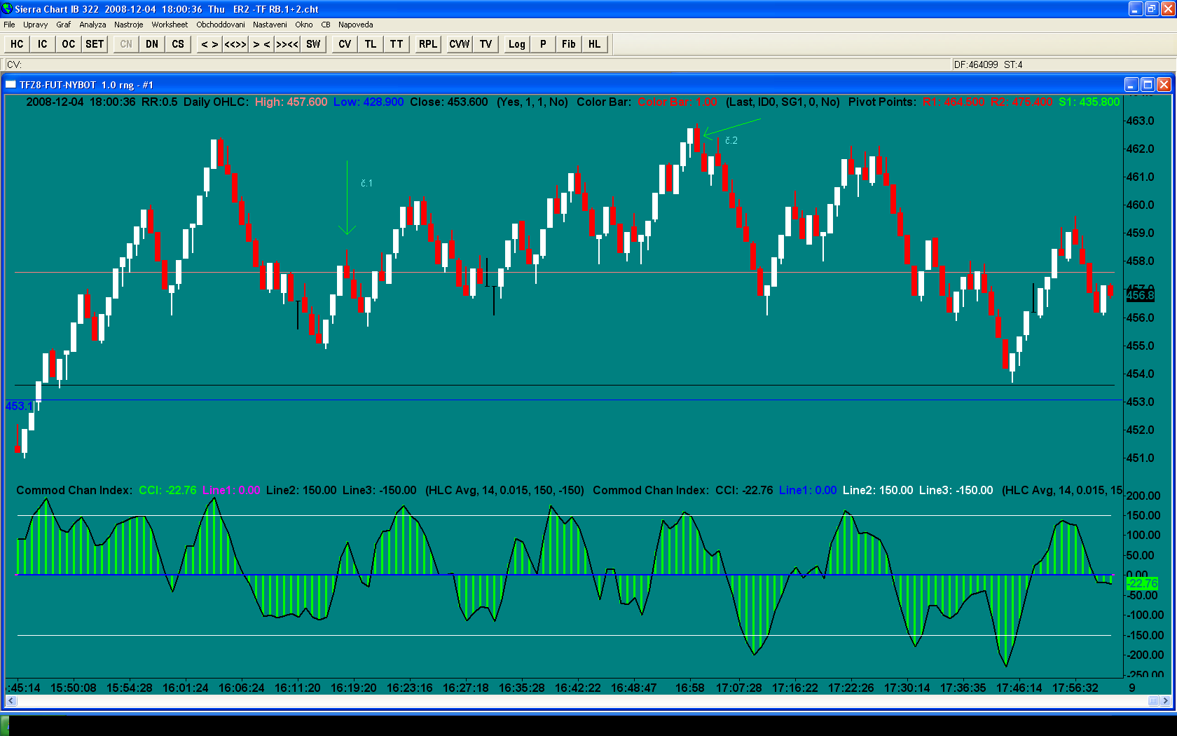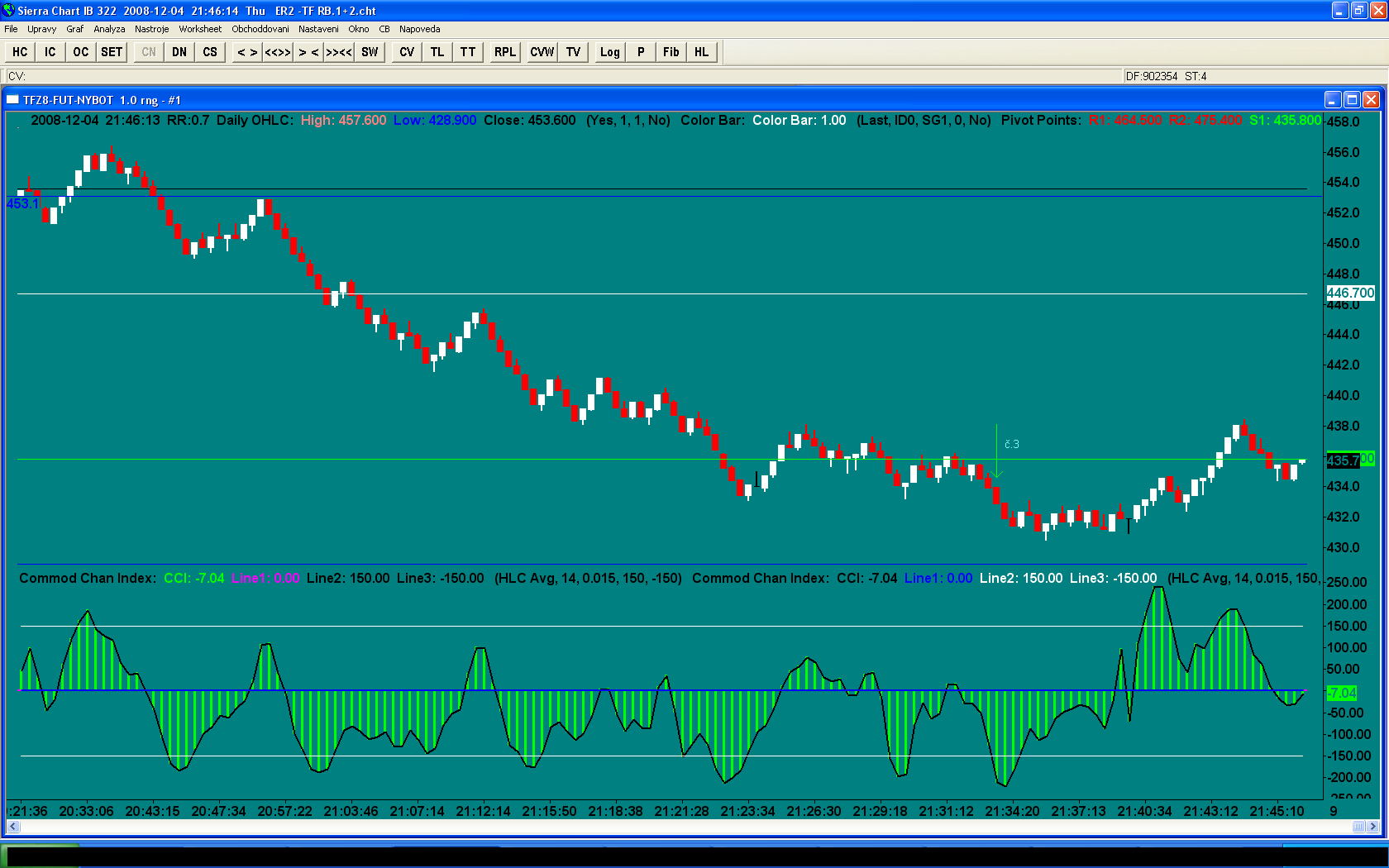 Zdravím, mé dnešní obchody.Na úvod bych napsal,že obchoduju trh TF na range barech.Zprvu jsem se snažil najít pro mě co možná nejlepší nastavení RB,zkoušel jsem nastavení na vstupním tf v rozpětí od RB 0,5-1,3 skoro jsem zakotvil na RB 1,1 nakonec jsem ještě udělal malou úpravu na RB1,takže používám 2 grafy RB1+RB2.V grafu mám zakresleny pivoty,dále high,low,close minulého dne a přesnou hodnotu indexu 0(přechod indexu z plusu do mínusu a naopak).Taky mám CCI,ale nějakou velkou váhu mu nepřikládám,pokud je pěkná divergence tak signálu věřím o trochu víc,ale úplně pevně se ho nedržím až možná na jednu strategii kterou obchoduju..Při této hodnotě kontraktu TF mám daný SL 8 ticků,posunuji na BE+2 po 10 ticích a pak pozici řídím dle posouvaného SL,kdy trhu dávám polštář 14 ticků,pevný PT nepoužívám,pokud je nějaká pro mě výrazná s/r tak ho tam vložím,ale většinou vystupuju dle posouvaného SL.Jelikož je TF "divočák a má hodně slipů při plnění tak do trhu vstupuju limitem až po začátku vykreslování dalšího baru a vždy 1 tick uvnitř minulého baru ,takže čekám až si pro mě trh přijde,i za cenu že mě některé obchody utečou,pokud mě trh už o 6 ticků uteče ruším pokyn,protože případný návrat už je skoro bar proti mě.Při spekulaci na průraz DH/DL vstupuju vždy 5 ticků pod DH nebo 5 ticků nad DL,to je jediná startegie kde vstupuju stop příkazem,a slipy tam mám v minimálně 50% vstupů,to je prostě TF. Obchod č.1 -RR k high minulého dne vstup 457,5,výstup 457,2 (posouvaný SL,slip 1tick proti mě)-spokojenost Obchod č.2 -DT na denním high vstup 462,výstup 461,8 (SL na BE+2)-spokojenost Obchod č.3 -průraz DL vstup 433,5,výstup 432,8 (posouvaný SL)-aktuální DL bylo před vstupem 433,1(slip 1 tick proti mě) borax