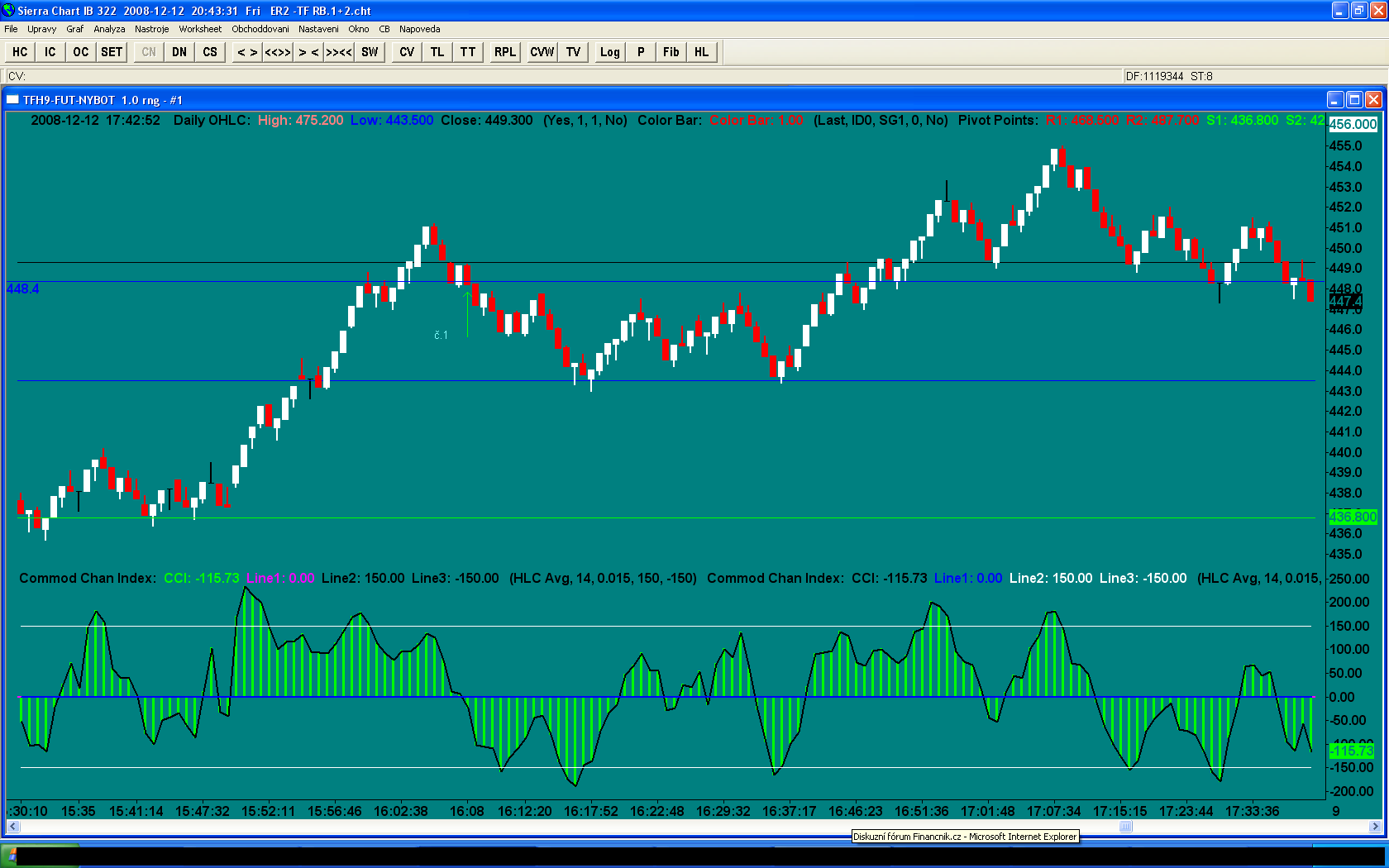 15. 12. 2008 Sim NQ 1) Sell Stop 1193.50; 2 kontr vstup na prorazeni 1-2-3 High po vstupu posunut ( zmensen ) PT1 nad hlavni pivot PP vystup PT1 15tick - pote co trh tesne minul muj PT1 a udelal korekci, jsem ho jeste trochu pritahl PT2 12tick - hodne pritahnuty SL celkem: 27 tick 2) Sell Limit 1185.75; 2 kontr vstup na TTE na Ross Hook po prorazeni 1-2-3 High; vystup PT1 20tick; PT2 8t - pote co trh udelal 2 zelene svicky ( vyssi tf ) proti a trh prechazel do Congestion jsem hodne pritahnul TSL a byl vyhozen celkem: 28 tick