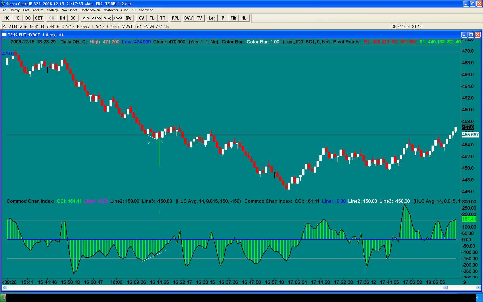 Zdravím. Dnes 15.12.08 - NQ 1 live trade Dnes, když už jsem se konečně rozhodl vstoupit do trhu na signálu, který odpovídá všem mým představám, si spletu strany long a short v DOMu a místo short jdu long. Když už trh nejde proti mě, tak já jdu. Já nevím, asi trochu smůla dneska, mám teď smůlu ve všem, to by bylo přece, abych vydělal peníze. :-/ Samozřejmě jsem si toho hned všiml, tak jsem trochu zmatkoval místo exit jsem klikl cancel all, takže se zrušil SL a trh si šupal dolu tak jsem dal rychle exit a vyvázal jsem na -45 včetně komise.