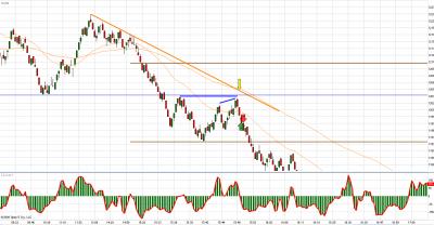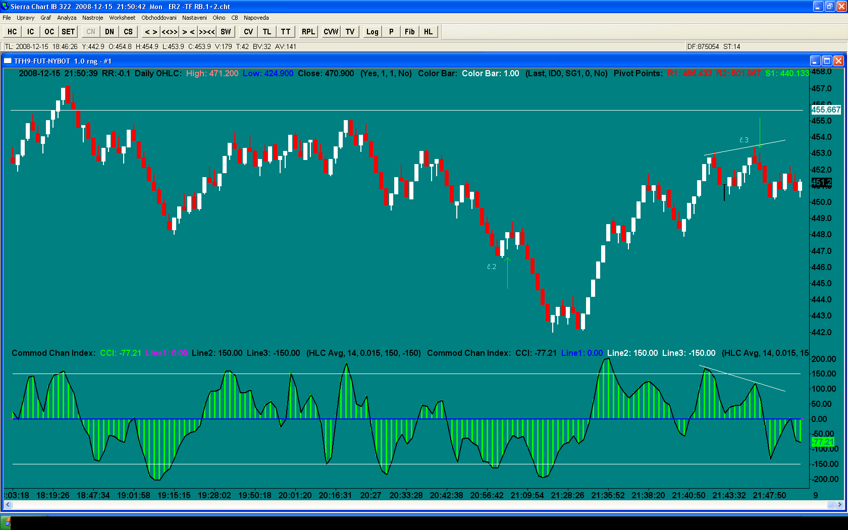 Zdravím, dnes 3 obchody 2 x be+2 1 x win. Obchod č.1 -tak toto byl totálně hloupý obchod,který si zasloužil rozhodně skončit na SL,šel jsem totálně nesmyslně up,proti hodně silnému trendu,dolů,i přes výstup se štěstím na BE+2,velká nespokojenost. Obchod č.2 -docela slušný DB na DL,trh už nebyl tolik down. Obchod č.3 -trh se ke konci dne zase pěkně rozhýbal,DT podpořen i divergencí na CCI,signál byl pěkně vidět i na RB2,tady jsem byl se sigálem spokojen. Celkově mám pocit zase takový smíšený,trh opět velmi pěkně padal a já zase nebyl schopen na nějakém signálu vstoupit,spíše mě to pořád nutilo brát signály proti trendu,což je k ničemu.Trošku si ted začínám uvědomavat,že mám spíše vstupy založeny na obratech v trhu,nějak mě nejde vstupovat do rozjetých trendů,tedy kromě RR.