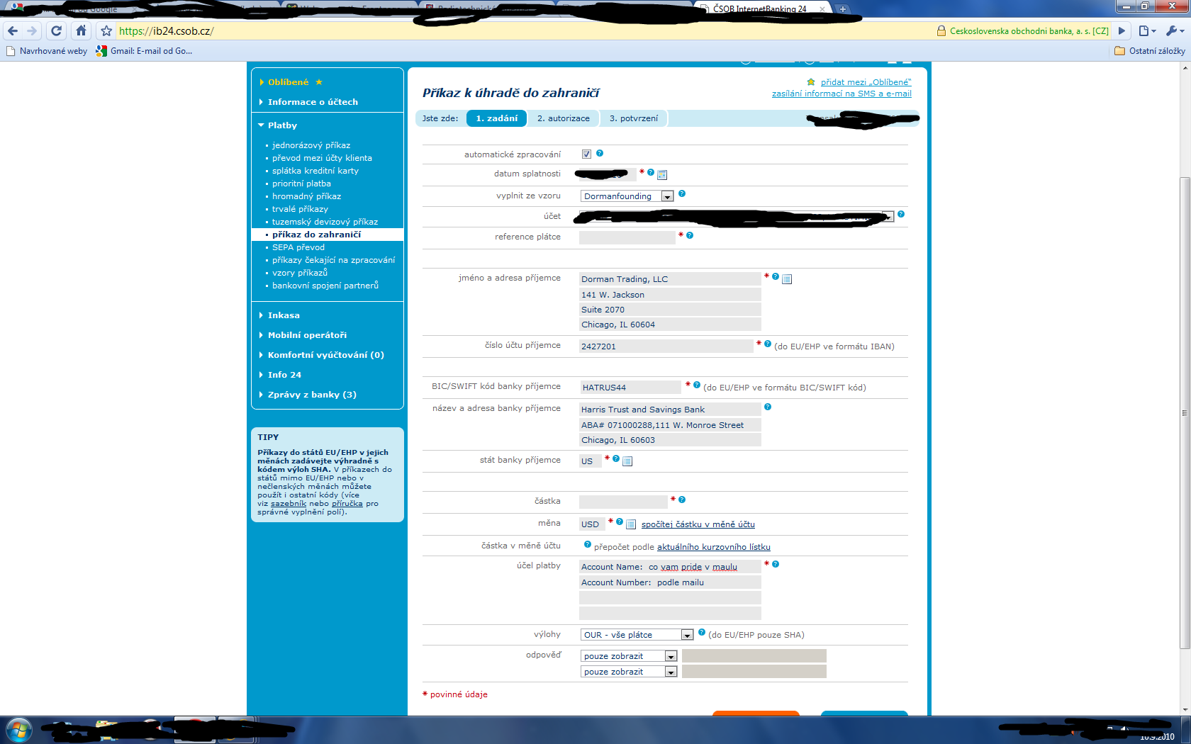 Tak popisu jak jsem postupoval ja sam pri registraci. Takze na strankach Mirus Futures sem si dal vyplneni on-line prihlasky, pres Dormana. Nic sloziteho, vystacite si ze zakladni znalosti anglictiny, stejne 70% je jen upozorneni na rizika ap TEsne nez poslete tiskopis, tak si musite stahnout jeden jediny soubor, ktery by mel byt na konci stranky. Ten vytisknete (pokud ne, tak vam pride emailem jako potvrzeni). Jak se jmenuje jiz nevim ale je v pdf. TAkze vytisknete, vyplnite podle udaju, ktere vam dosli v potvrzovacim mailu a poslete zpet na DORMANA, ne na MIRUS. PAk jiz jen cekate az se vam ozve broker z mirusu. Co se tyce dokumentu, ja sem mu poslal sken obcanky no a potom treba ucet od elektriny,plynu,inkasa, nebo neco podobneho, na potvrzeni adresy. ME psal AJ, byl jsem s nim jiz predtim v kontaktu, posle vam udaje kam poslat penize, na jaky ucet. Ucet si muzete v podstate zalozit kdykoliv a mate 90 dni na to, abyste jej mohli nafundovat. JA osobne jsem posilal penize v pondeli a ve ctvrtek mi jiz prisel mail s postupem jak aktivovat live ucet, naprosto bez problemu. Penize jsem posilal pres CSOB, poplatek byl kupodivu jen 400 CZK. DOle prikladam obrazek jak by to melo vypadat.