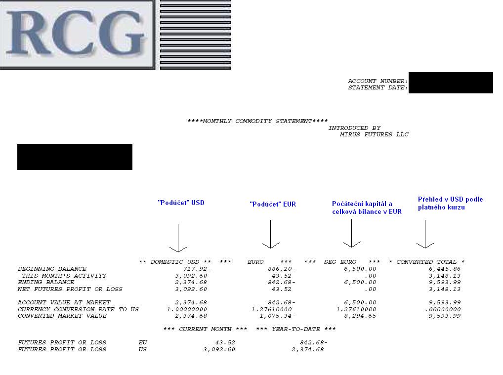 Malá ukázka jednoho z prvních výpisů od RCG. Citlivé údaje jsem začernil. Říká to něco o tom, že jsem ten měsíc začínal se ztrátou 886€ a 718$, souhrn aktivit (tohle je 3. strana výpisu, na předchozích 2 stranách jsou PnL den po dni) a finální rekapitulace - zůstatek na konci měsíce a rekapitulace za rok.