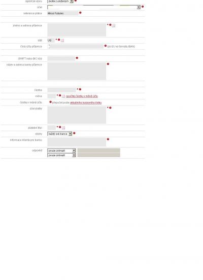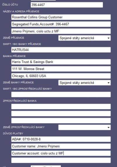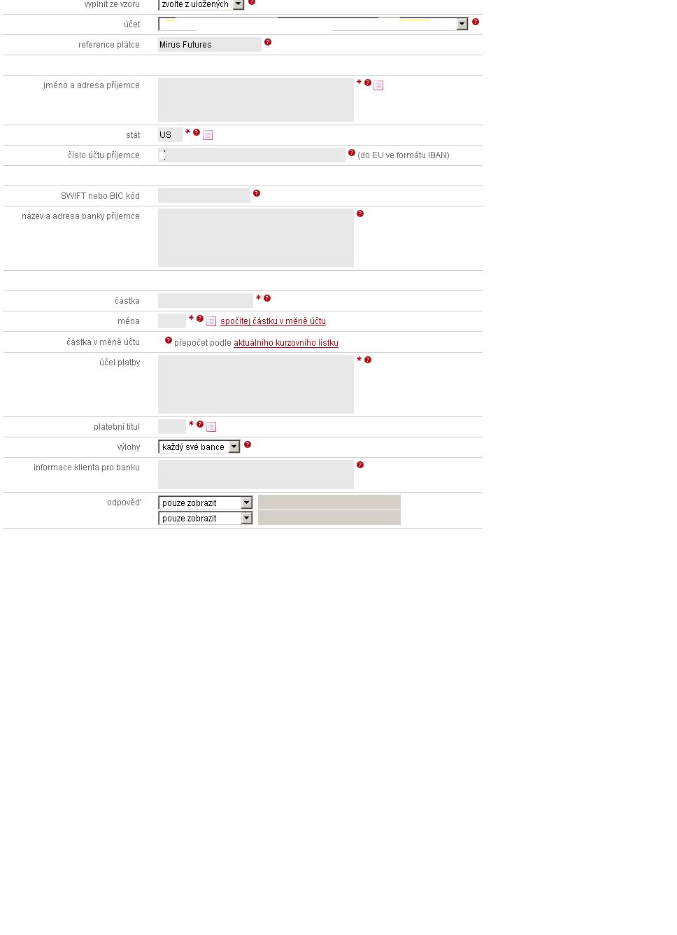 Já jsem to nakonec vyplnil hodně podobně jak yax, ale zatím to sem nechci dávat, protože ještě nepřišlo potvrzení, že jsou peníze na účtu, tak abych případnou chybou nezmátl někoho jiného.