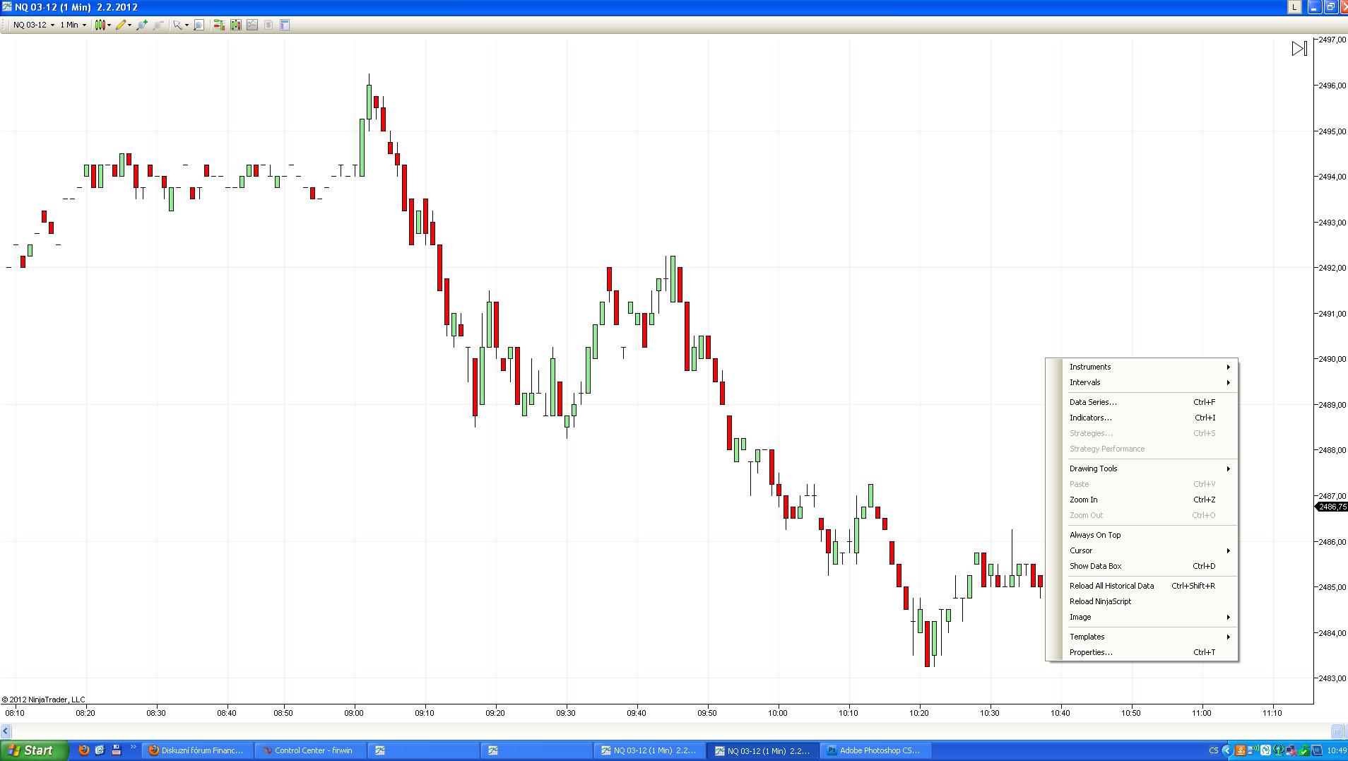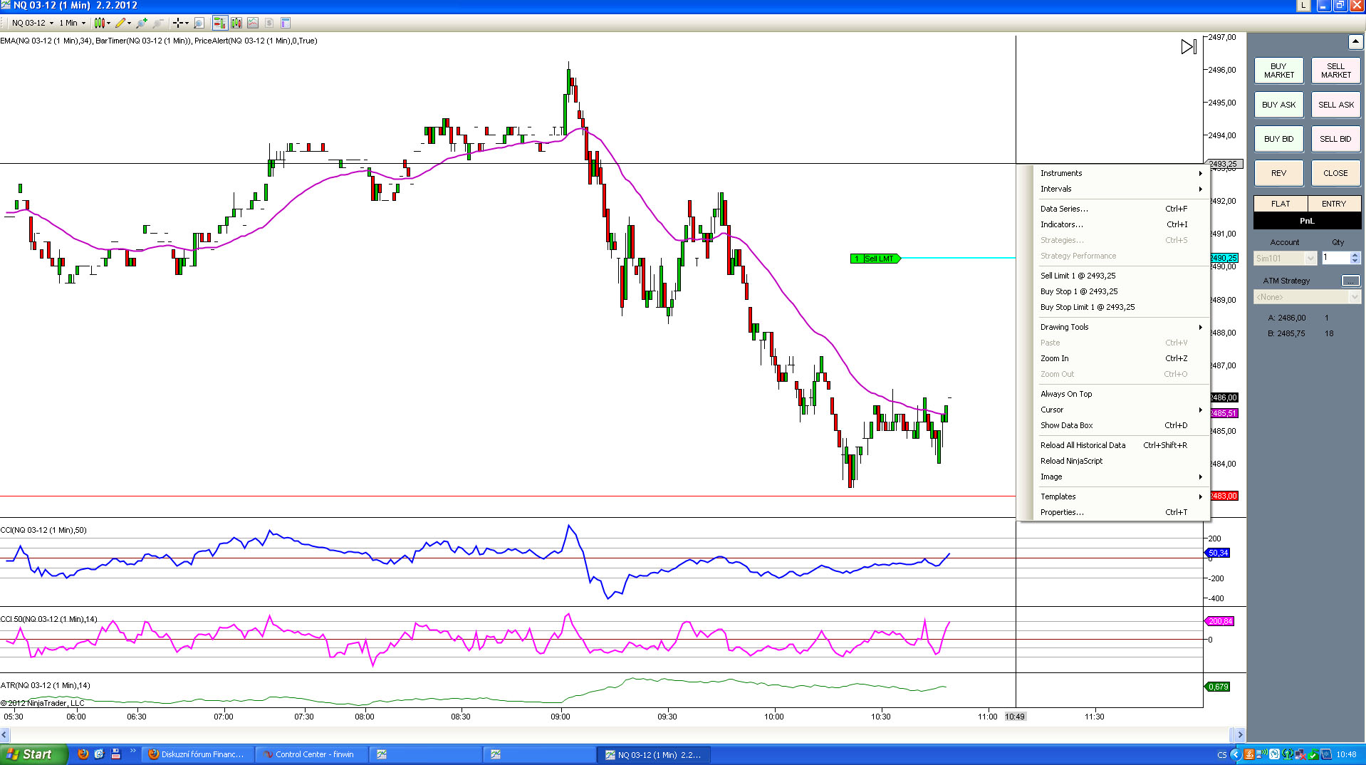 úspěšně jsem se napojil na data od CQG a přemigroval svůj Ninja Trader. Mám free verzi a tím pádem bych již neměl mít možnost obchodovat přes ChartTrader, což mi taky nejde. Zajímavé ale je, že když do otevřeného grafu natáhnu nějakou šablonu, ChartTrader normálně funguje. Mohu zadávat všechny příkazy, tak jako tomu bylo s daty od ZenFire. Pokud ale otevřu holý graf bez šablony, ChartTrader zmizí.